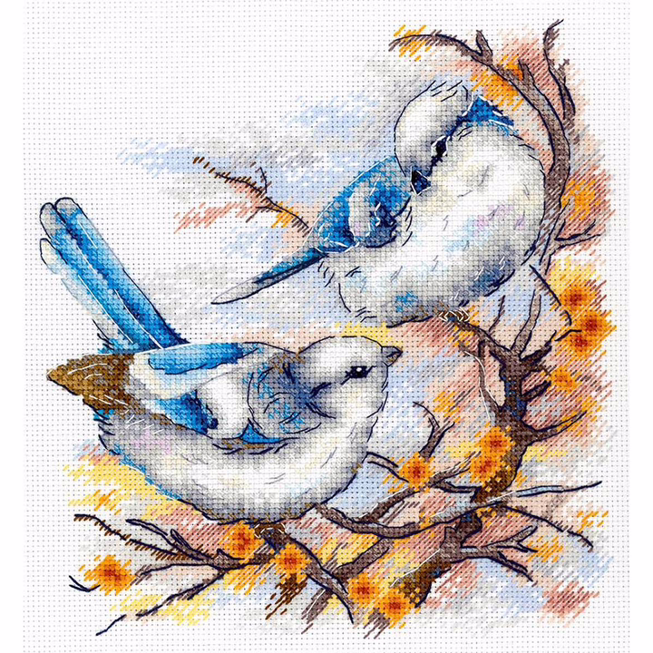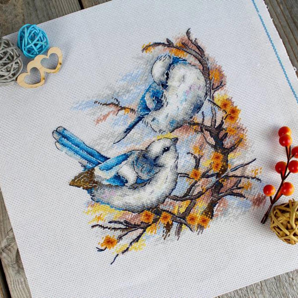 На полотне изображены милые птички, уютно расположившиеся на ветке, окружённой яркими листьями. Каждый шаг вышивания будет наполнен радостью и вдохновением, а готовая работа станет ярким акцентом в вашем интерьере или замечательным подарком для близких.