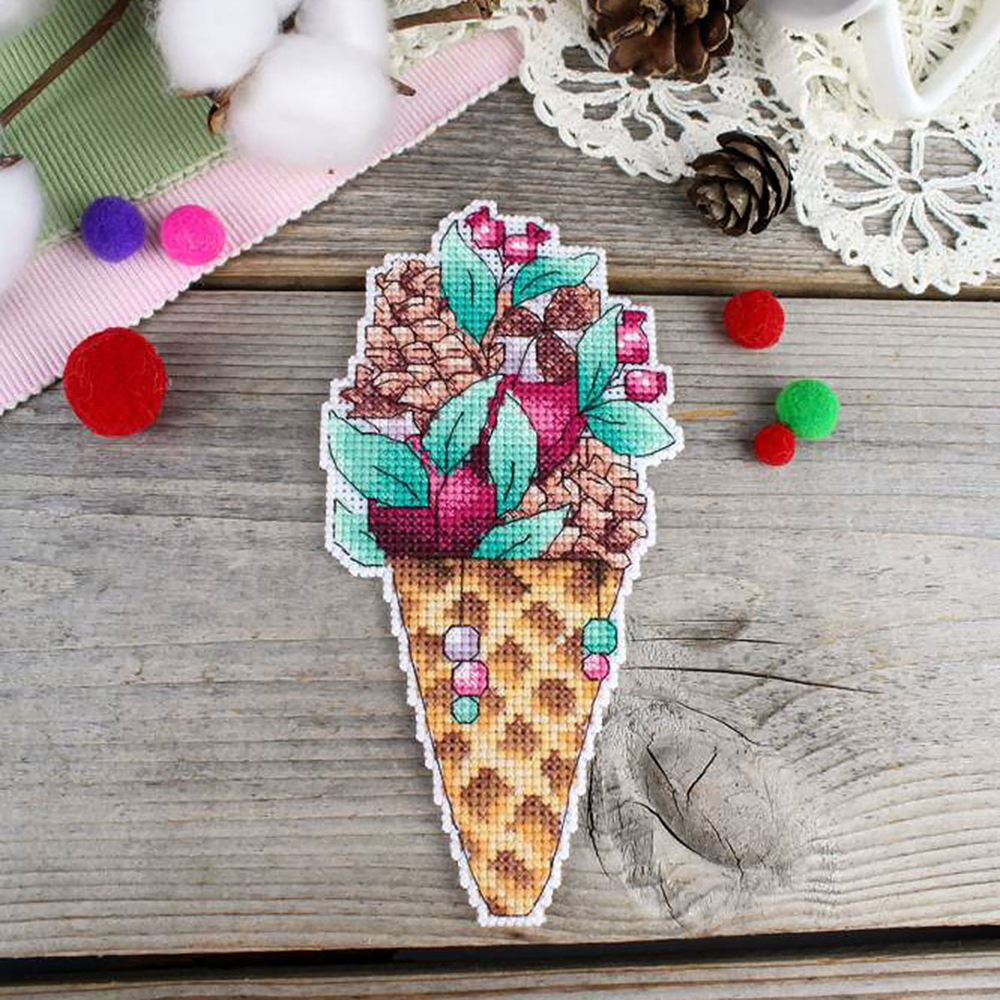 Полученная вышивка крестом представляет собой готовый сувенир в виде вышитого вафельного рожка с шишками и не требует дополнительного оформления в багет или рамку. Основа из пластика не нуждается в специальной обработке. Вышивка крестиком украсит ваш дом к праздничным мероприятиям или станет отличным подарком близким людям.