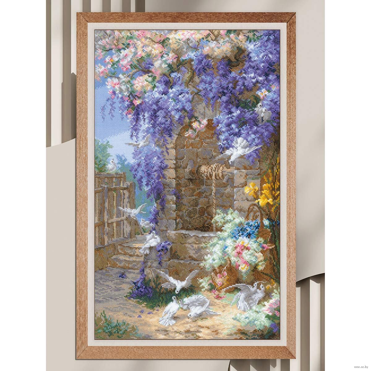 Вышитая картина, вдохновленная работой Э. Бидо, переносит зрителя в атмосферу очаровательного дворика, наполненного яркими красками, теплом и светом.
