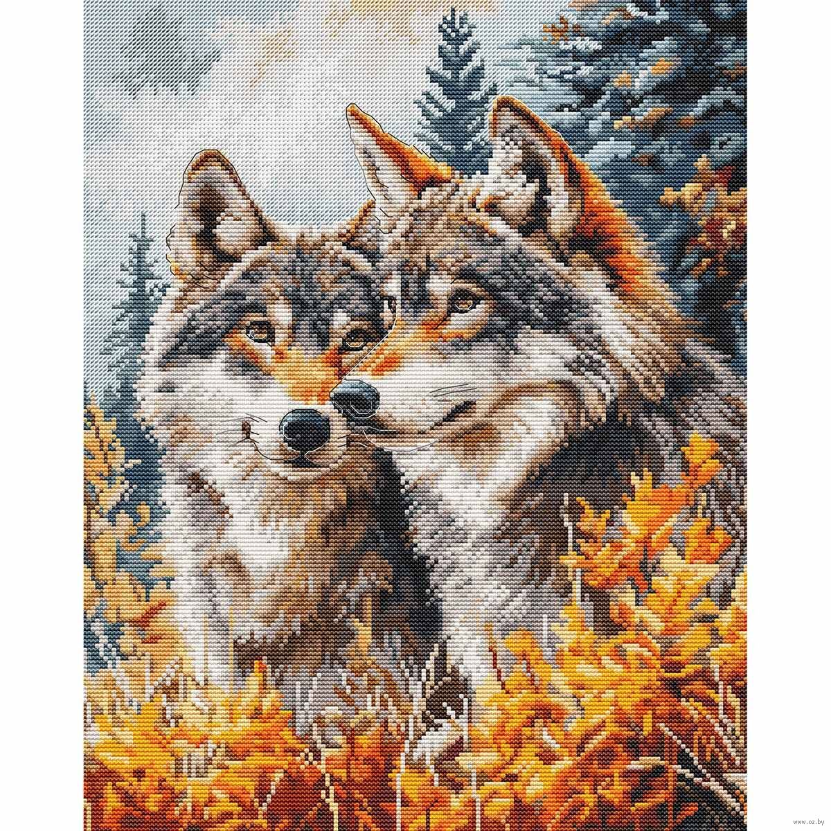 Готовая вышивка крестом с изображением двух величественных волков, стоящих на фоне густого леса, символизирует силу, ум и магию дикой природы. Эта картина, исполненная в нежных, гармоничных тонах, привнесёт в ваш интерьер уют и спокойствие, напоминая о приятных моментах, связанных с процессом создания.