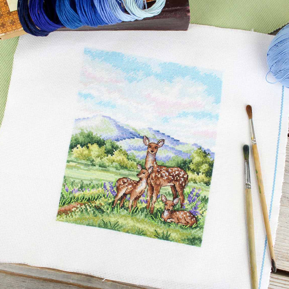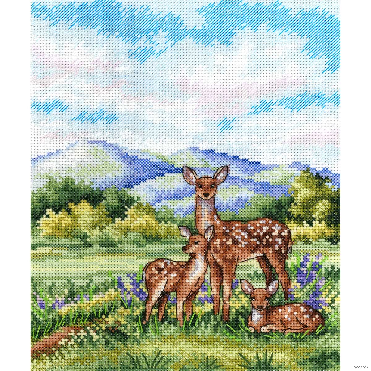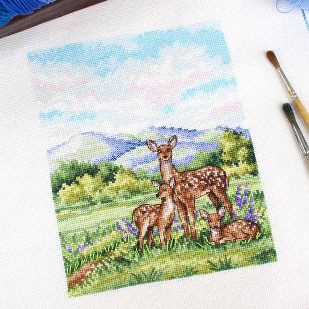 На вышивке изображены олени на фоне чарующей природы. Каждый элемент пейзажа и фигуры животных выполнены с особой тщательностью, передавая всю глубину и богатство природного мира. Готовая работа станет ярким акцентом в вашем интерьере или замечательным подарком для близких.
