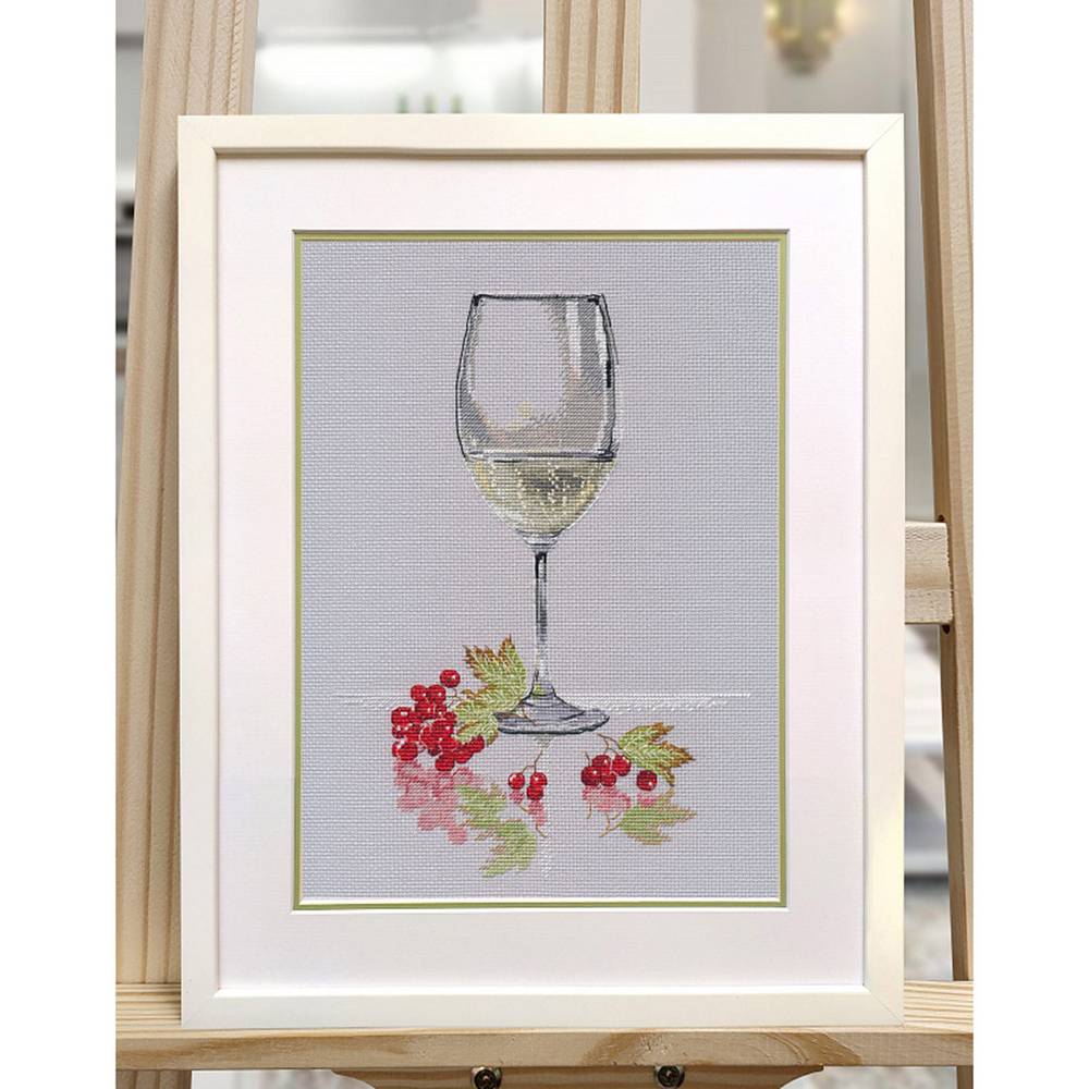 Полотно погружает зрителя в атмосферу неповторимой симфонии вкуса и красоты. Изящные контуры бокала и сочные ягоды делают эту вышивку привлекательной и праздничной.