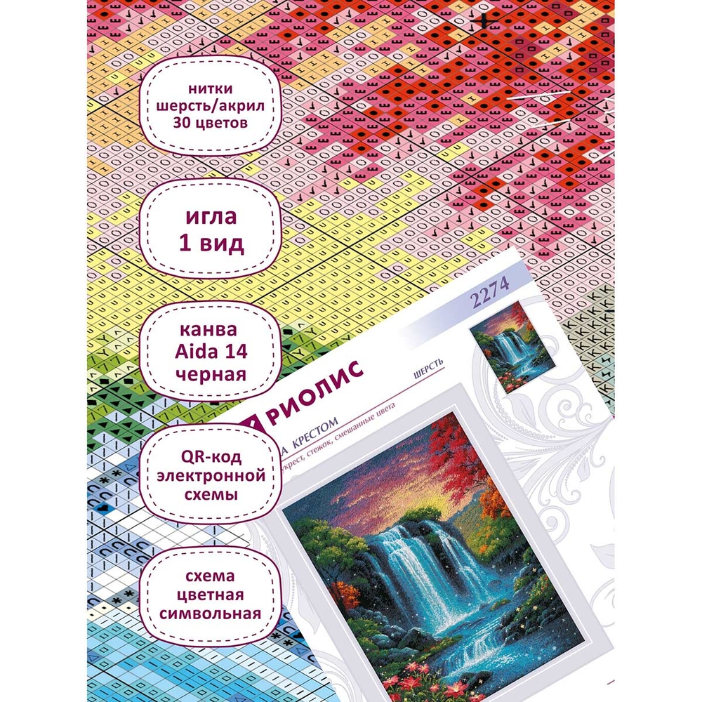 Вышивка крестиком в наборе включает в себя все необходимое для создания красивой картины: канву Aida 14 ct черную, мулине (шерсть/акрил), иглу, бумажную цвето-символьная схему, QR-код электронной схемы, инструкцию.