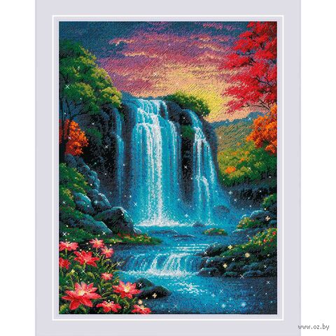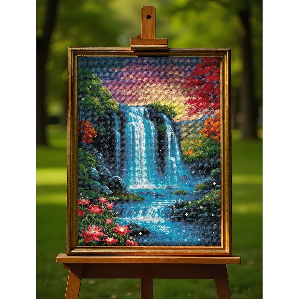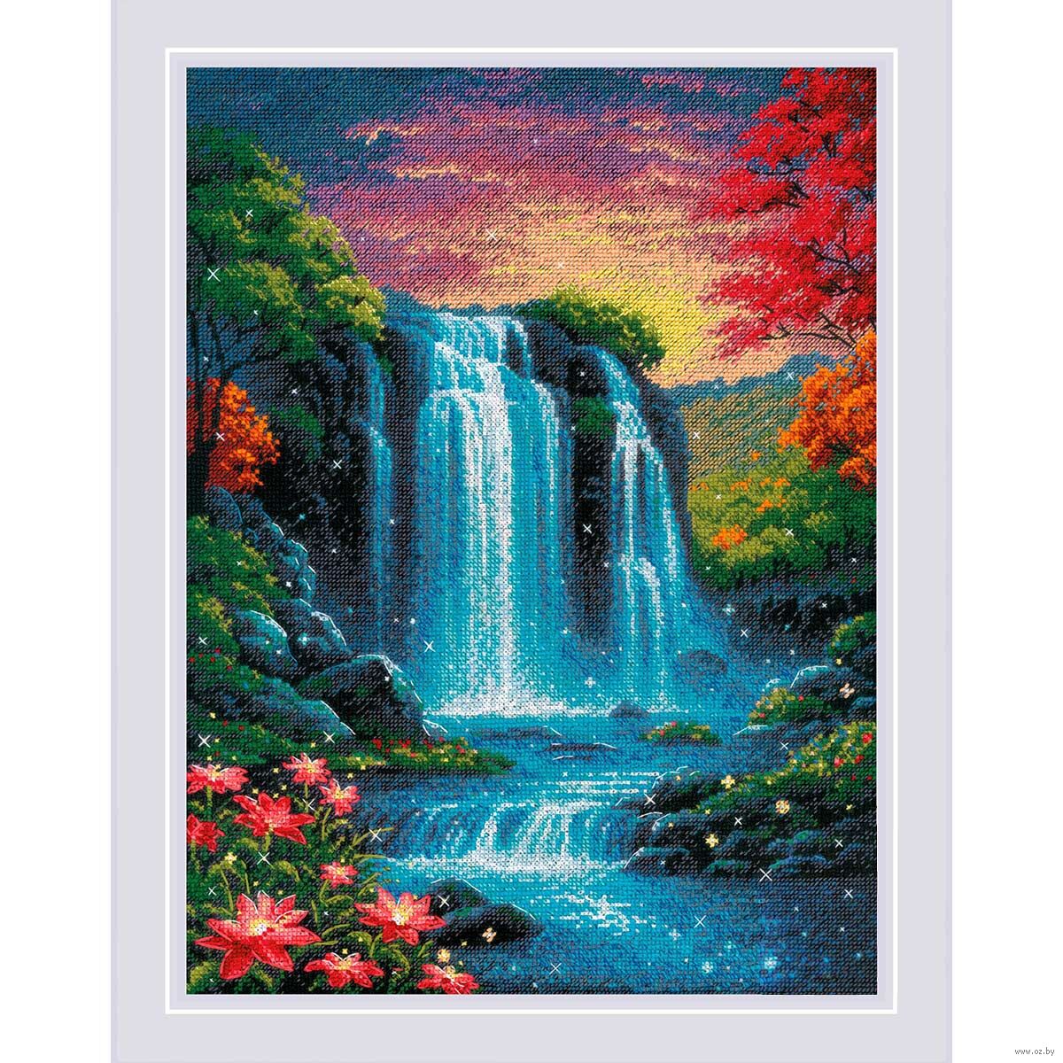 Вы сможете создать уникальное и неповторимое украшение комнаты, которое будет напоминать о ваших талантах и ручной работе. Вышивка крестиком – прекрасный подарок маме, бабушке, сестре, подруге на Новый Год, день рождения, новоселье и 8 марта. Композиция переносит в мир волшебства и природы, изображая завораживающий водопад, струящийся среди пышной зелени. Мастерски выполненные плавные линии и переливы голубых, бирюзовых и серебристых оттенков передают движение воды и её искрящуюся свежесть.