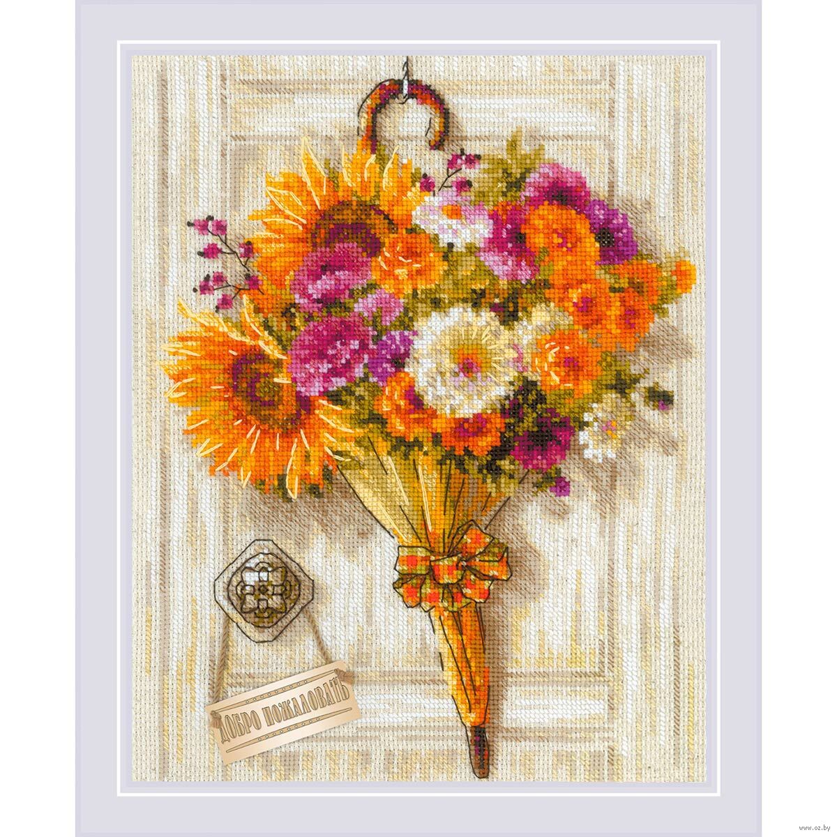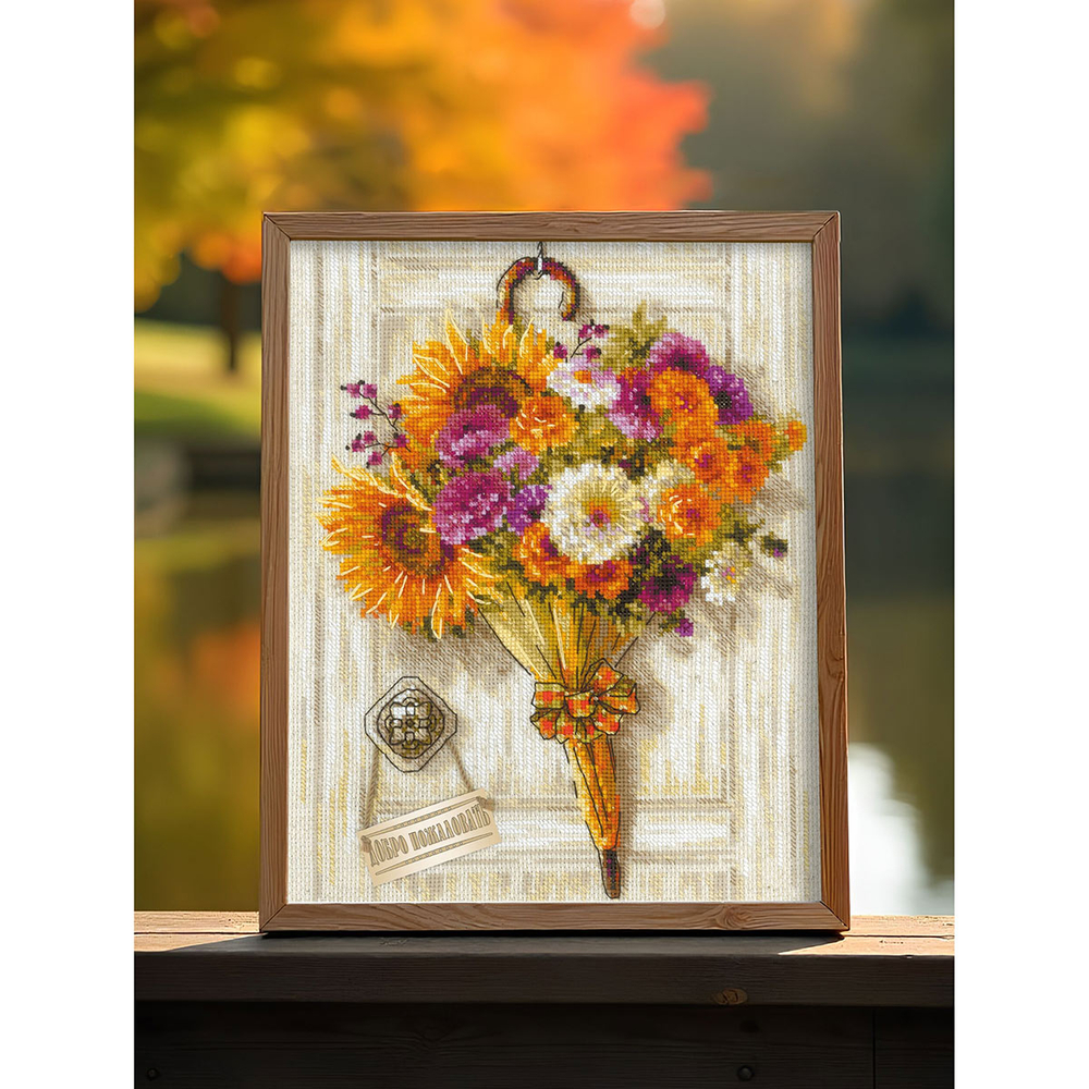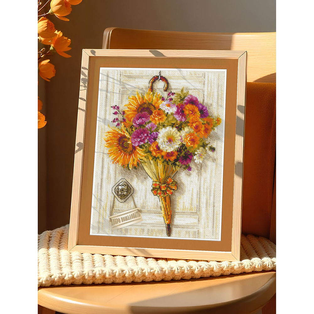 Вы сможете создать уникальное и неповторимое украшение комнаты, которое будет напоминать о ваших талантах и ручной работе. Вышивка крестиком – прекрасный подарок маме, бабушке, сестре, подруге на Новый Год, день рождения, новоселье и 8 марта. На вышивке зонт служит необычной вазой для яркого букета осенних цветов. Тёплые оттенки охры, золотистого и багрового переплетаются в каждом лепестке и листе.