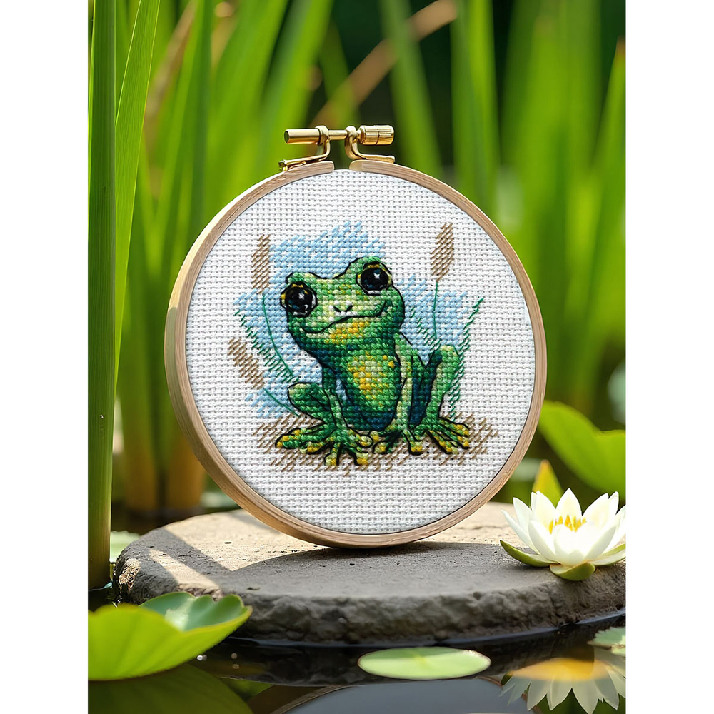 Вы сможете создать уникальное и неповторимое украшение комнаты, которое будет напоминать о ваших талантах и ручной работе. Вышивка крестиком – прекрасный подарок маме, бабушке, сестре, подруге на Новый Год, день рождения, новоселье и 8 марта. На вышивке изображен очаровательный маленький лягушонок с выразительными большими глазами. Вышивка отлично подойдет для украшения детской одежды или салфетки.