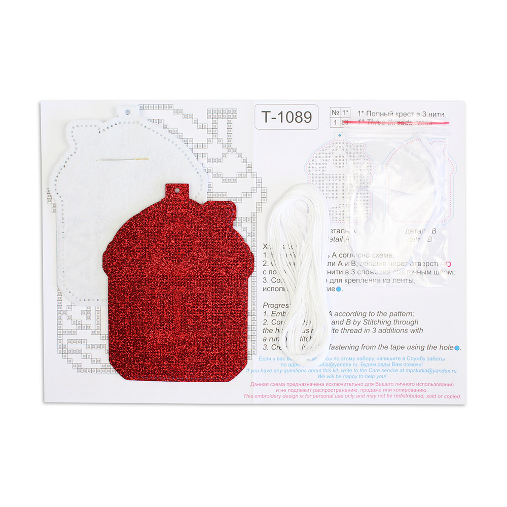 В наборе: перфорированный фетр, хлопковое мулине ПНК им Кирова, лента, игла, бумажная символьная схема, электронная схема, руководство по вышиванию.