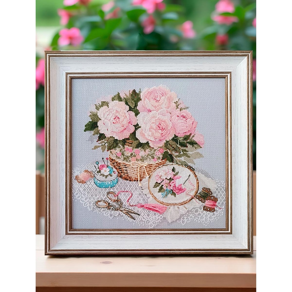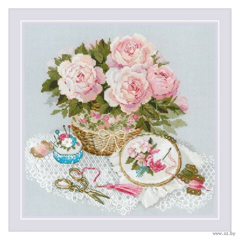 Вы сможете создать уникальное и неповторимое украшение комнаты, которое будет напоминать о ваших талантах и ручной работе. Вышивка крестиком – прекрасный подарок маме, бабушке, сестре, подруге на Новый Год, день рождения, новоселье и 8 марта. На вышивке иголки, пяльцы с полотном, мотки ниток и ножницы переплетаются с мягкими лепестками и зелёными листьями букета с розами, создавая атмосферу творчества и уюта.