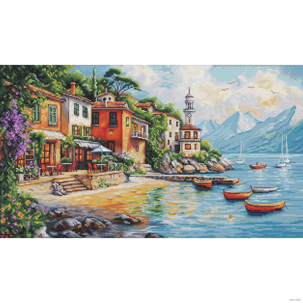 Готовая вышивка крестом с изображением живописного прибрежного городка, утопающего в солнечном свете и окружённого величественными горами, создает атмосферу романтики. На этом ярком полотне изображены красочные домики с террасами, уютно расположившиеся вдоль береговой линии.