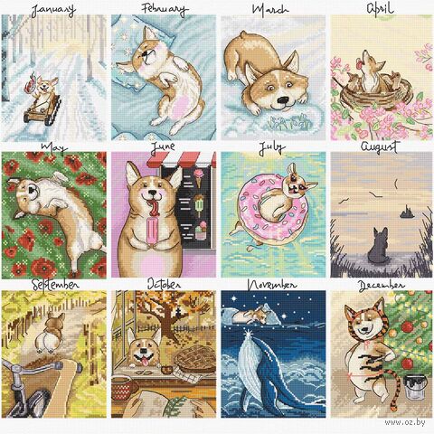 Готовая вышивка крестом с изображением календаря с нашими четвероногими друзьями, погружает зрителя в мир беззаботности и игривости.