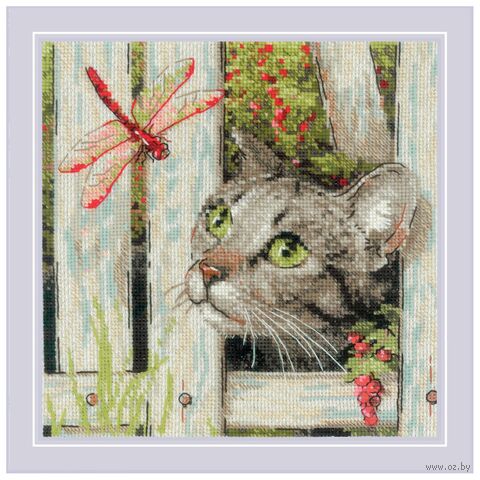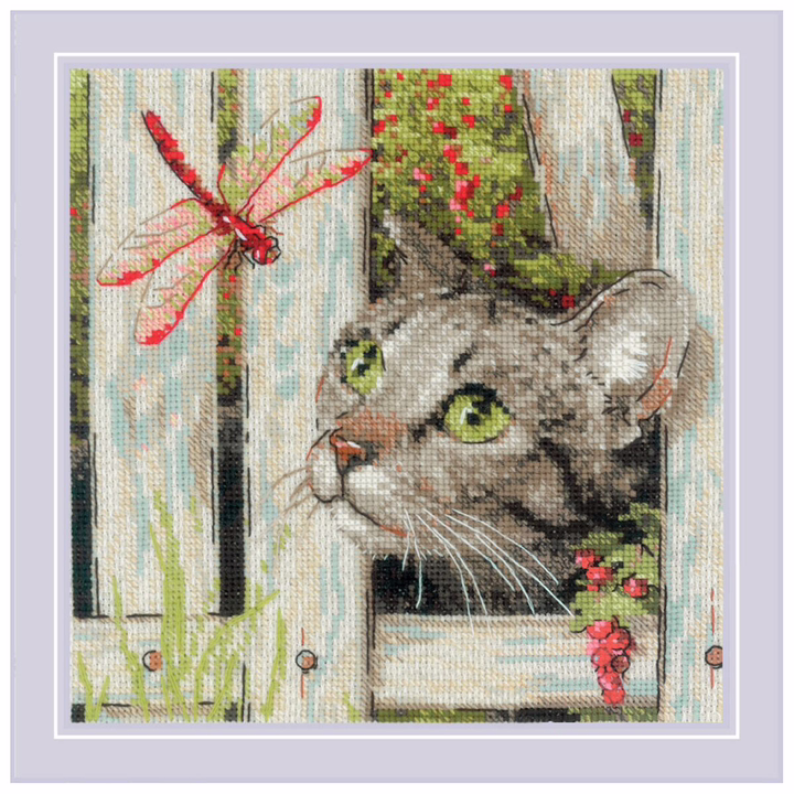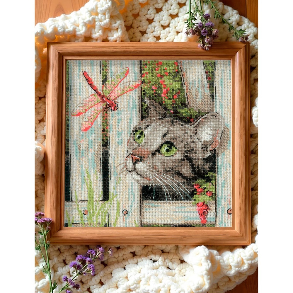 Вы сможете создать уникальное и неповторимое украшение комнаты, которое будет напоминать о ваших талантах и ручной работе. Вышивка крестиком – прекрасный подарок маме, бабушке, сестре, подруге на Новый Год, день рождения, новоселье и 8 марта. На готовом полотне изображен забавный кот, внимательно смотрящий на грациозную стрекозу. Детализированное изображение передает живое выражение любопытства и немного иронии, присущее этим животным.