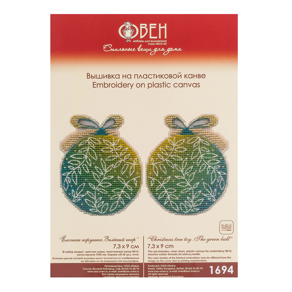 Вышивка крестиком набор для создания елочной игрушки "Зеленый шар" на пластиковой канве от бренда ОВЕН представляет собой уникальную возможность создать красивую и оригинальную вышивку с минимальными усилиями.