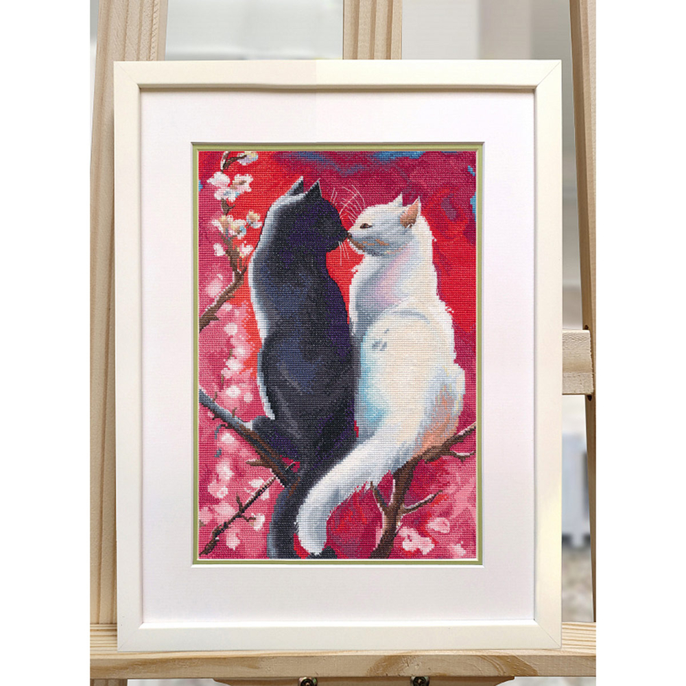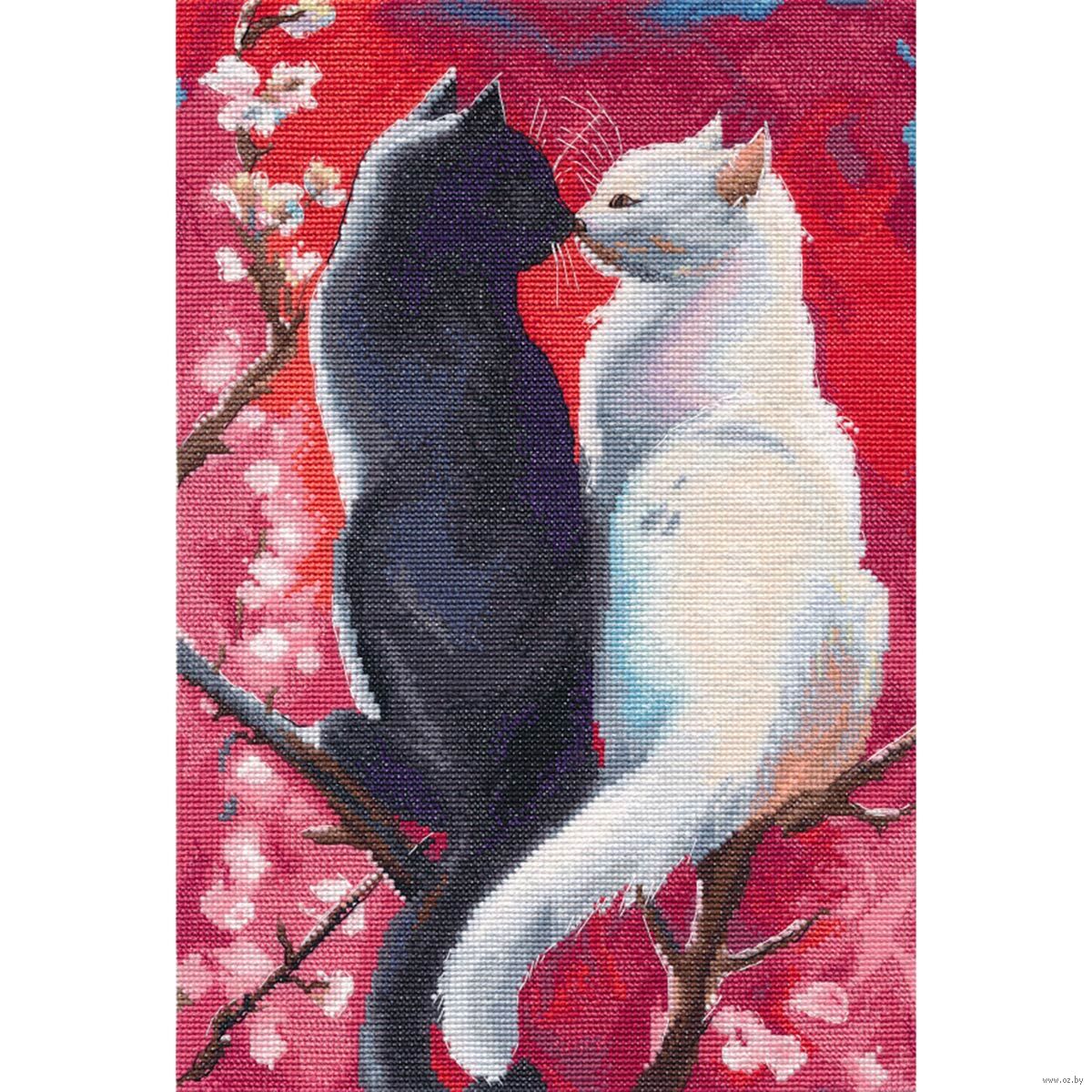Нежная и трогательная вышивка, изображающая двух очаровательных котов, создаeт атмосферу тепла, романтики и домашнего уюта. Каждый крестик, каждый стежок, кажется, пропитан теплом и любовью, создавая живописное полотно, полное деталей и эмоций.