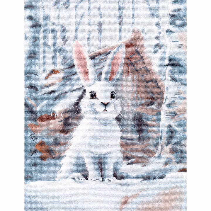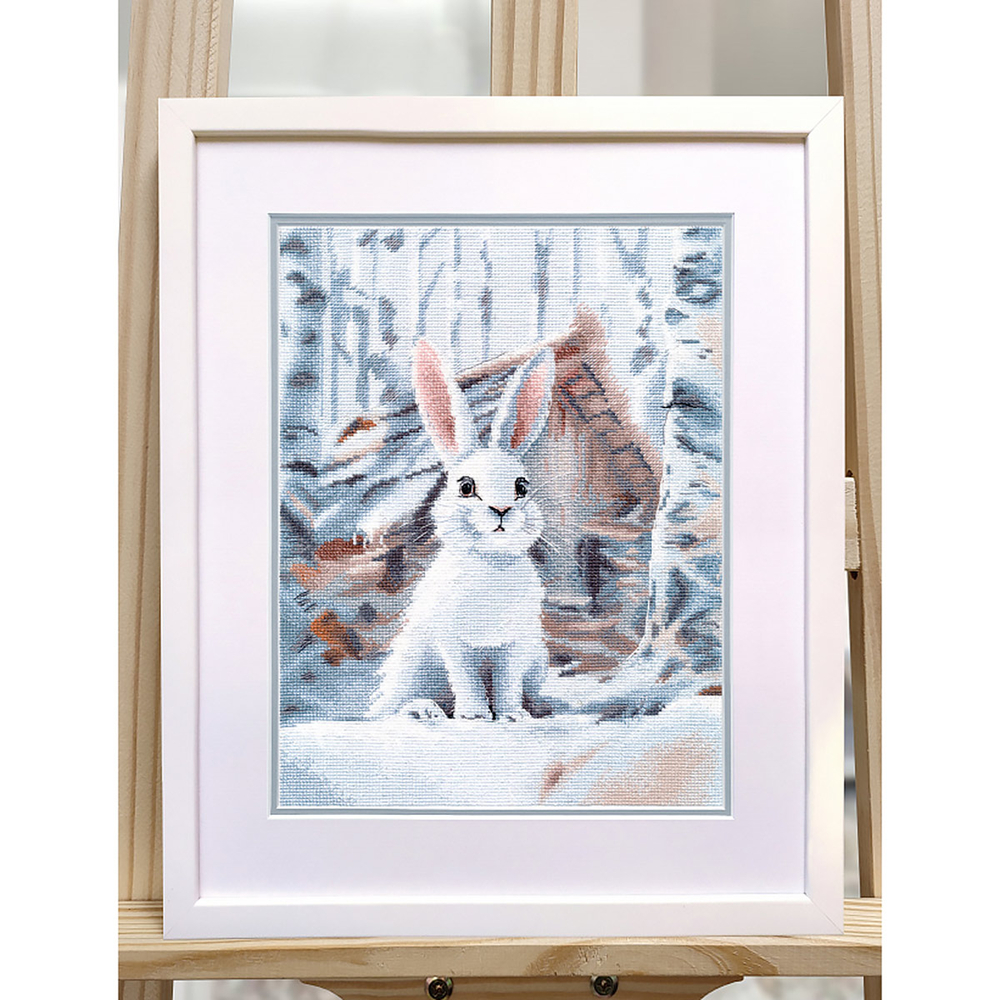 Очаровательная зимняя вышивка, изображающая пушистого зайчика с длинными ушками на фоне заснеженного леса, создает атмосферу волшебства, тепла и зимней сказки. Каждый крестик, каждый стежок, кажется, пропитан теплом и любовью, создавая живописное полотно, полное деталей и эмоций.