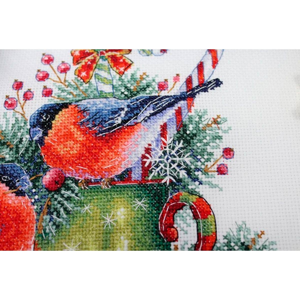 Сюжет "Зимние беседы" вышивается в разных техниках: "крест" позволяет делать цветовое заполнение, штрихи в технике "полукрест" придают изображению динамичность и эффект прозрачности, а стежки "бэкстич" создают четкие контрастные контуры. Готовая картина напоминает рисунок карандашами или акварелью.