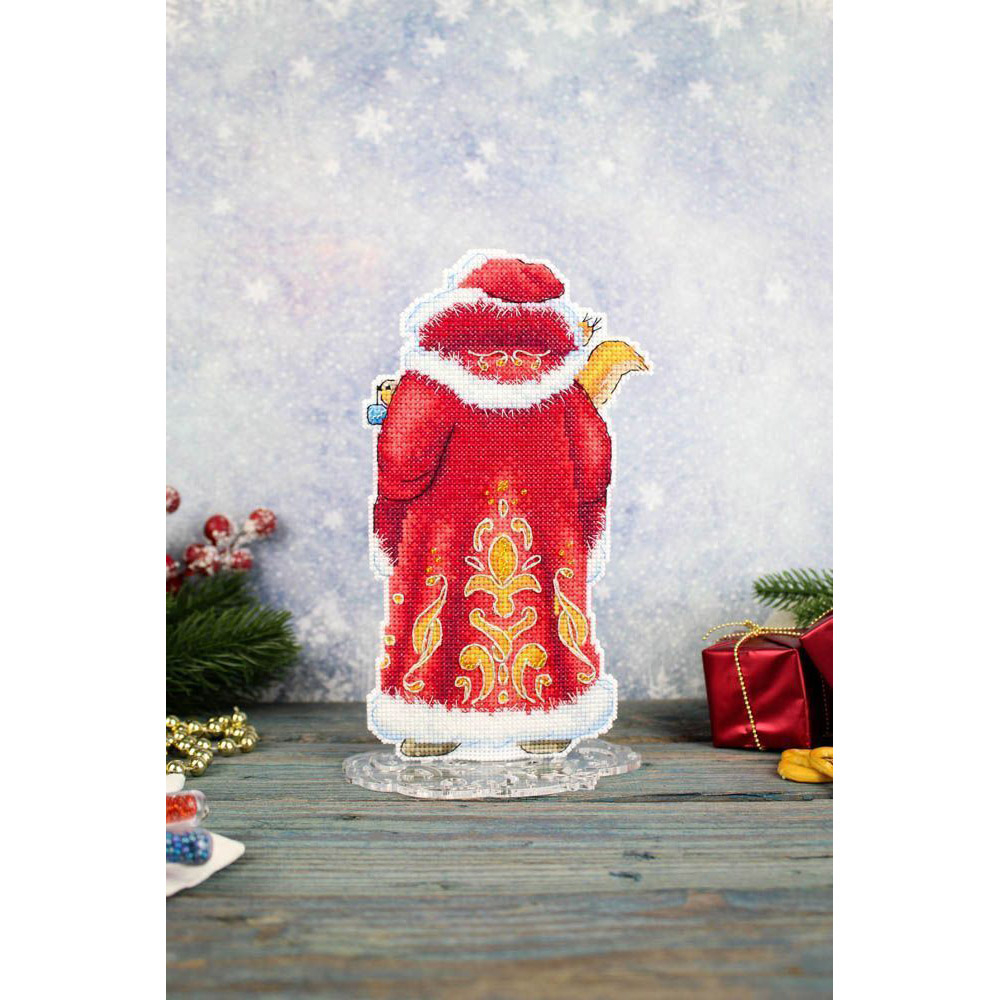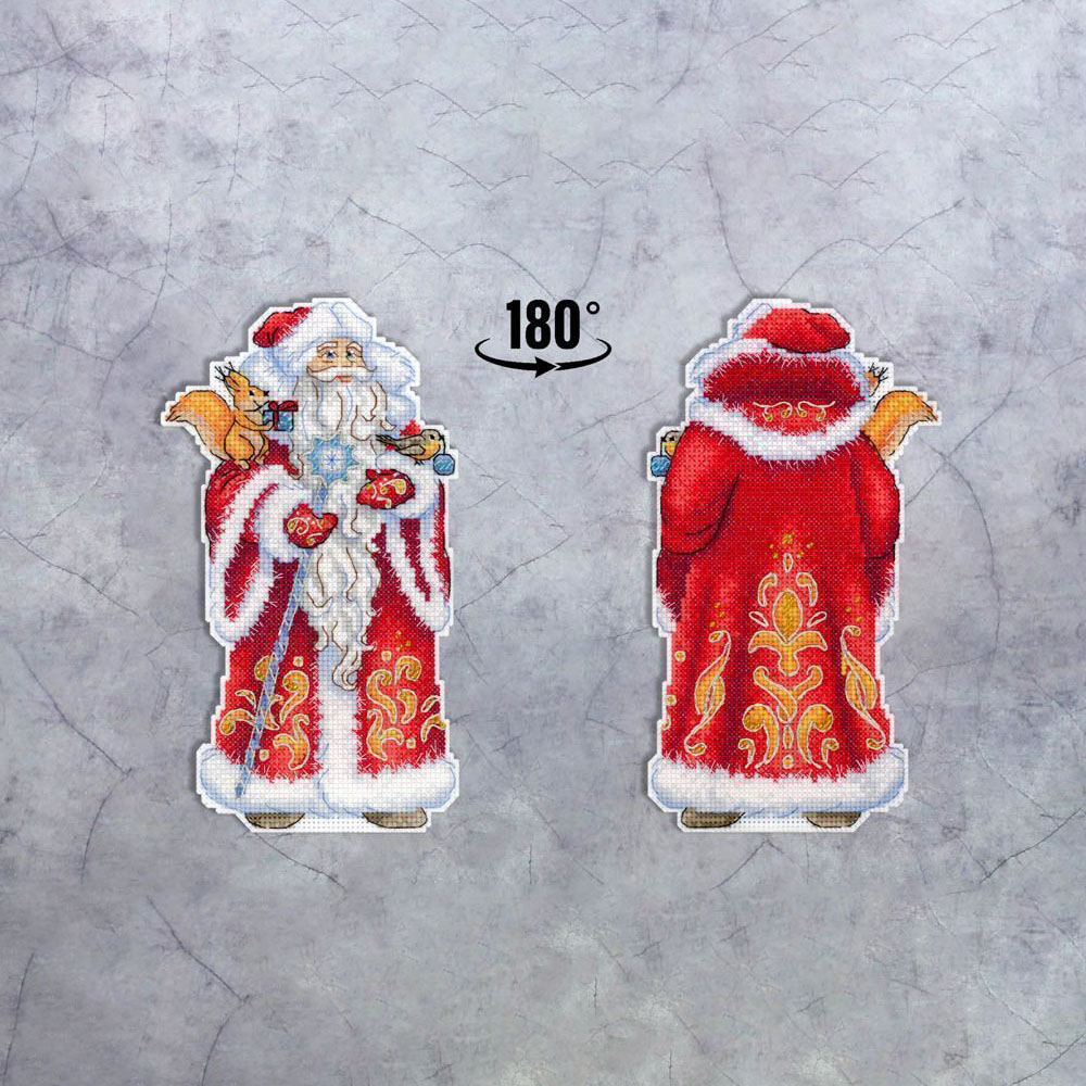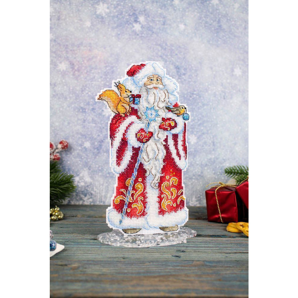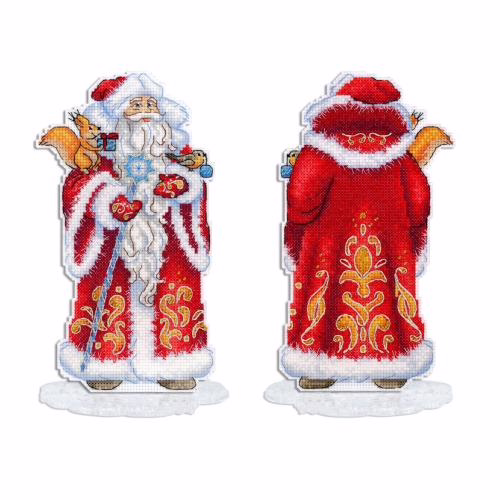Набор для вышивания на пластиковой основе "Дед Мороз" представляет собой уникальную возможность создать красивую и оригинальную вышивку с минимальными усилиями. Пластиковая канва прекрасно держит форму, поэтому пяльцы и рамки не нужны. Обе стороны Деда Мороза вышиваются по схеме, затем вырезаются по линиям, указанным в инструкции, и соединяются изнаночными сторонами внутрь. При желании можно добавить между элементами ленту для подвешивания.