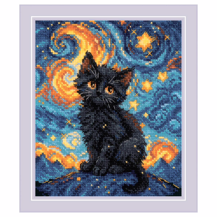 В центре композиции очаровательный и задумчивый черный котенок на фоне неба с мерцающими звёздами и вьющимися облаками. Готовая работа станет идеальным украшением интерьера, напоминая о магии звёздных ночей.