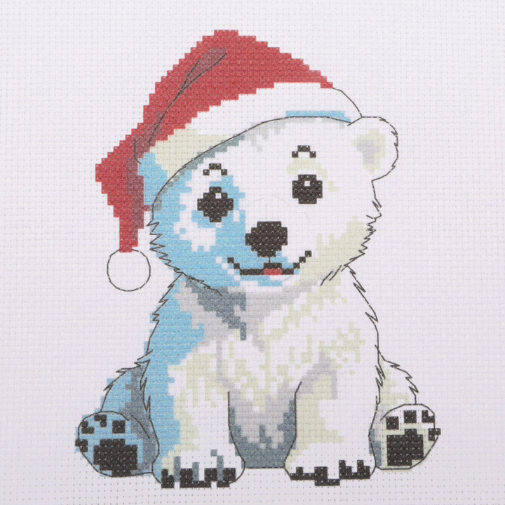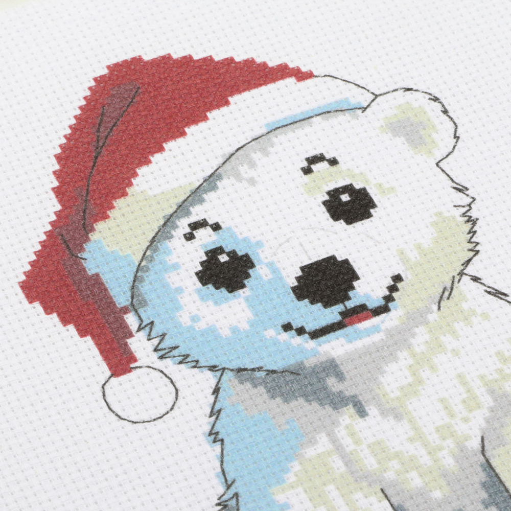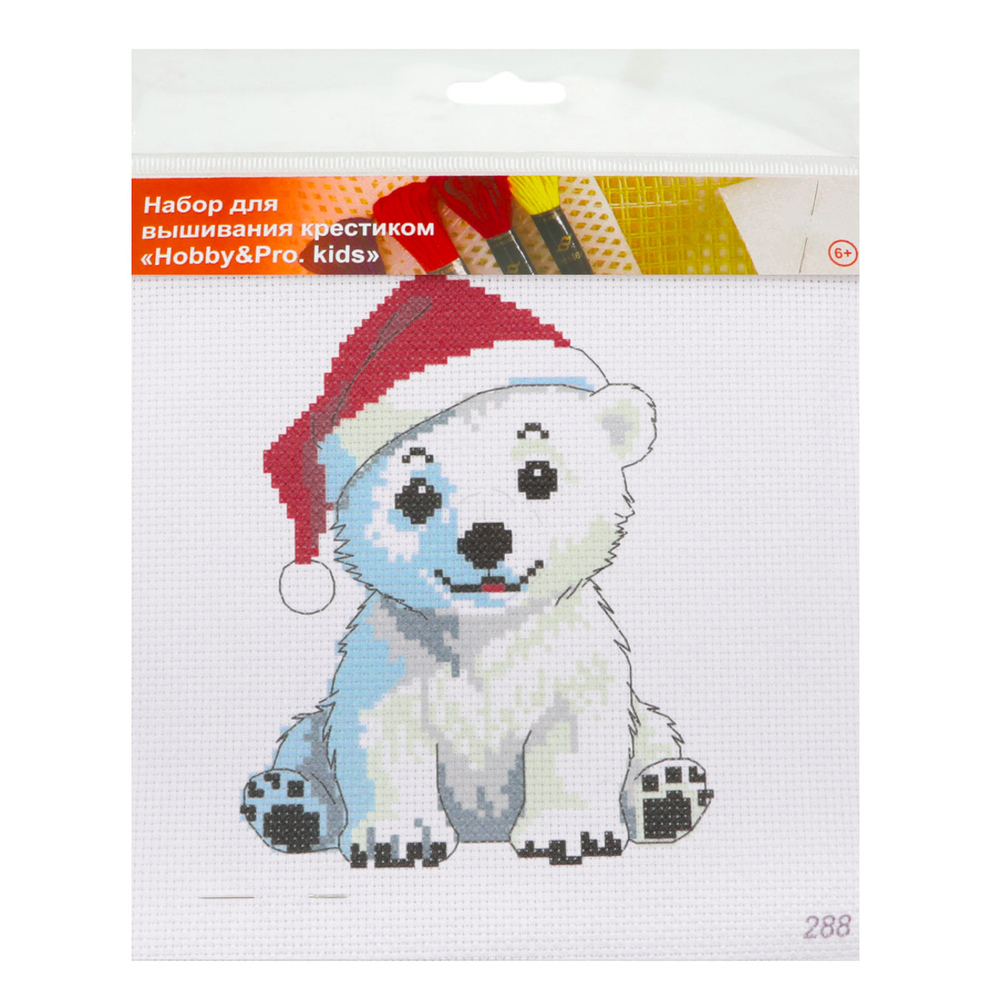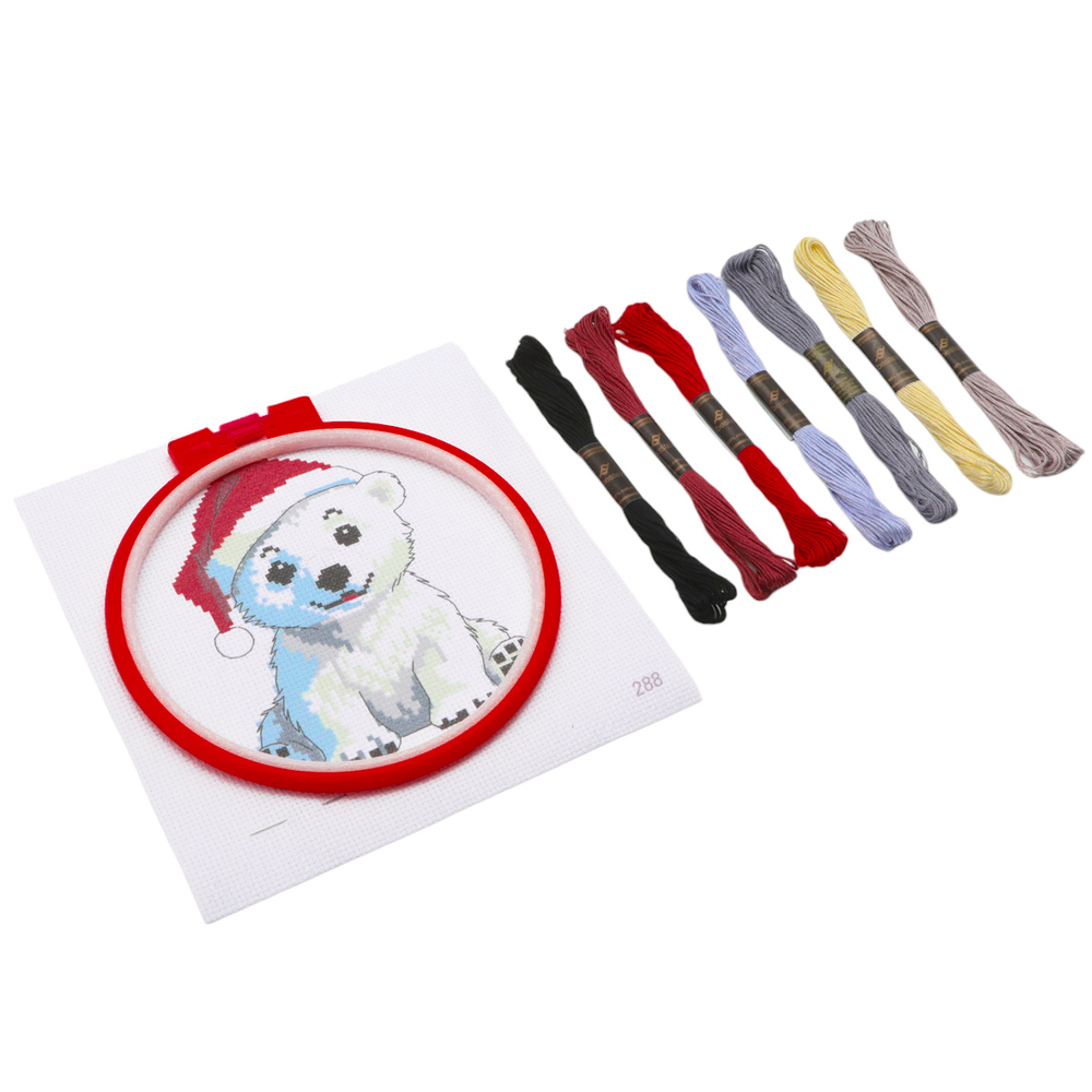 В набор входят разноцветные нитки мулине, пяльцы, канва Aida 14 с нанесённым рисунком, игла для вышивания.
