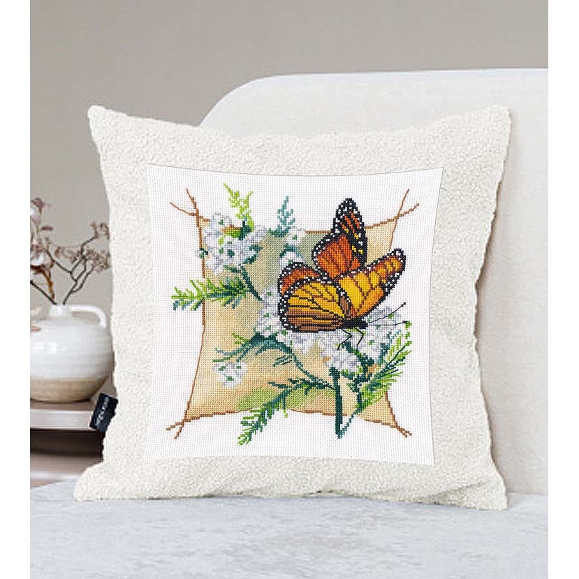 Бабочка, изящно раскрывая свои крылья, выполнена в нежных тонах с утонченными деталями, создающими эффект легкости и невесомости. Каждый стежок словно дышит жизнью, а гармоничная палитра делает вышивку особенно привлекательной.