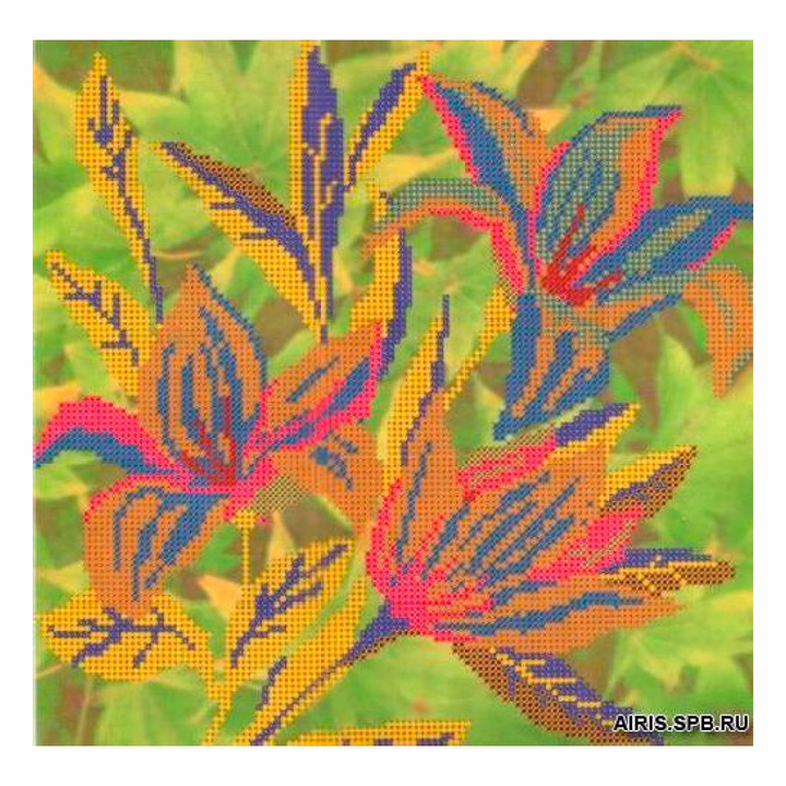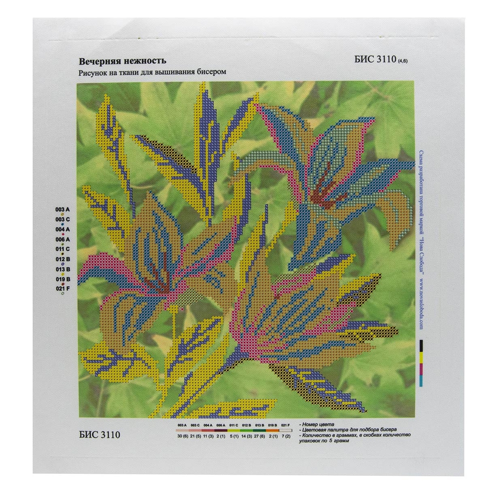 Ткань (габардин) с нанесенным рисунком-фоном, областями для вышивания и цветовой схемой для выбора бисера.