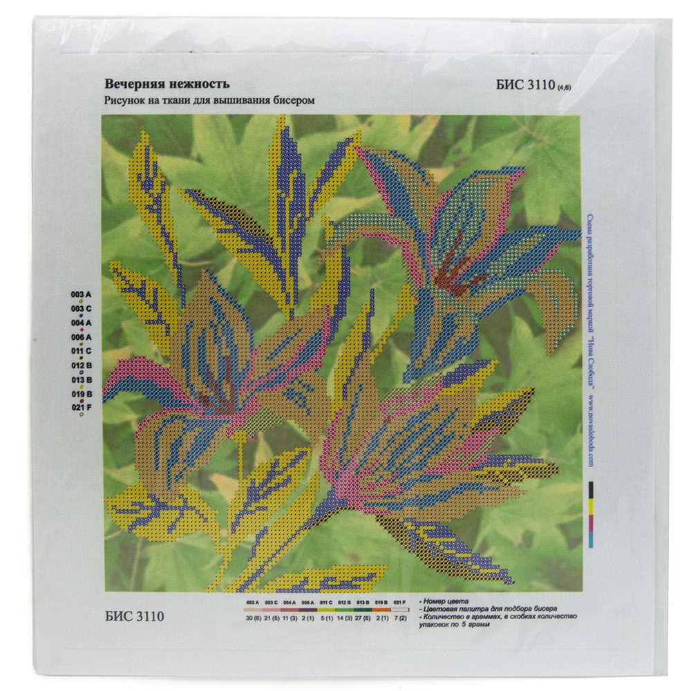 В наборе: ткань для вышивания, инструкция, карта цветов бисера Preciosa Ornela, образец нити для вышивания бисером.