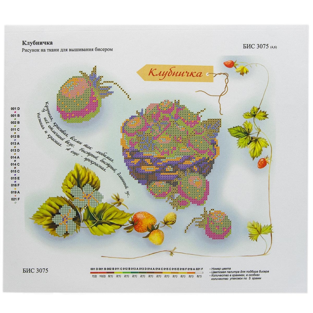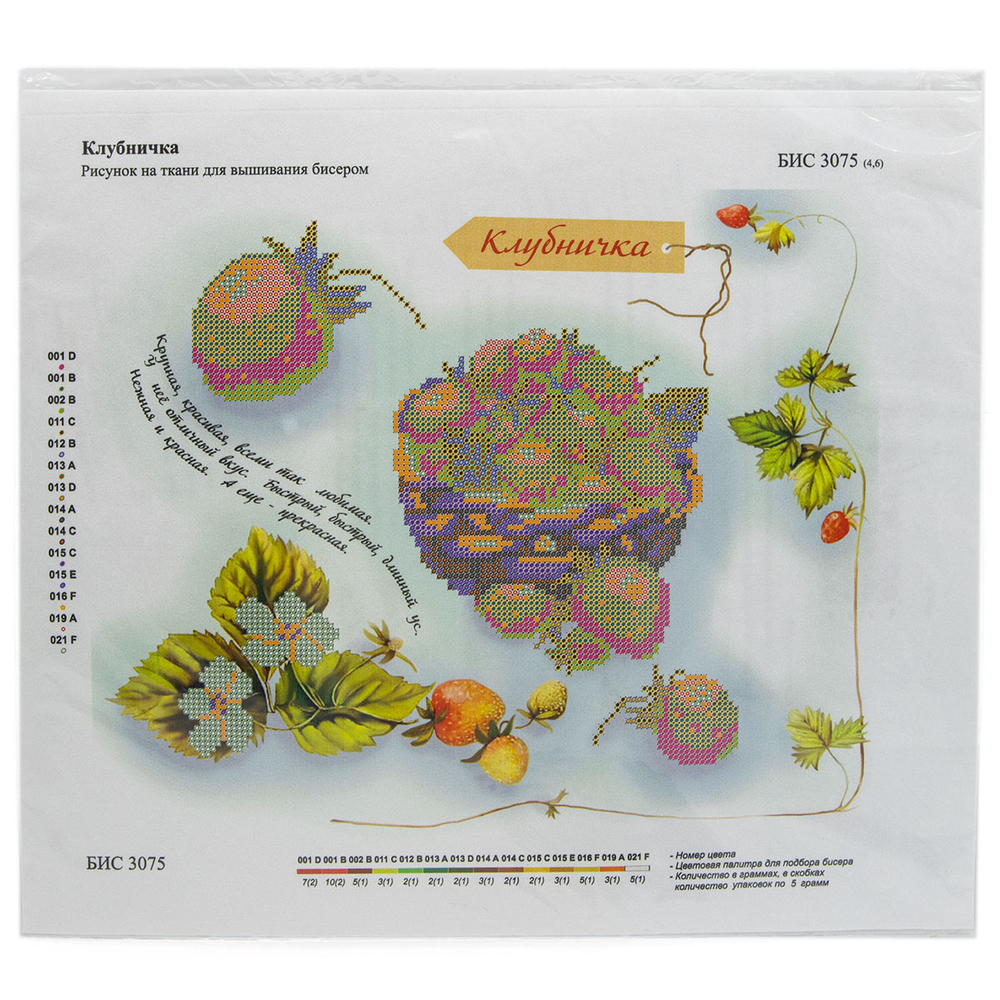 В наборе: кань (габардин) с нанесенным рисунком-фоном, областями для вышивания и цветовой схемой для выбора бисера, инструкция.