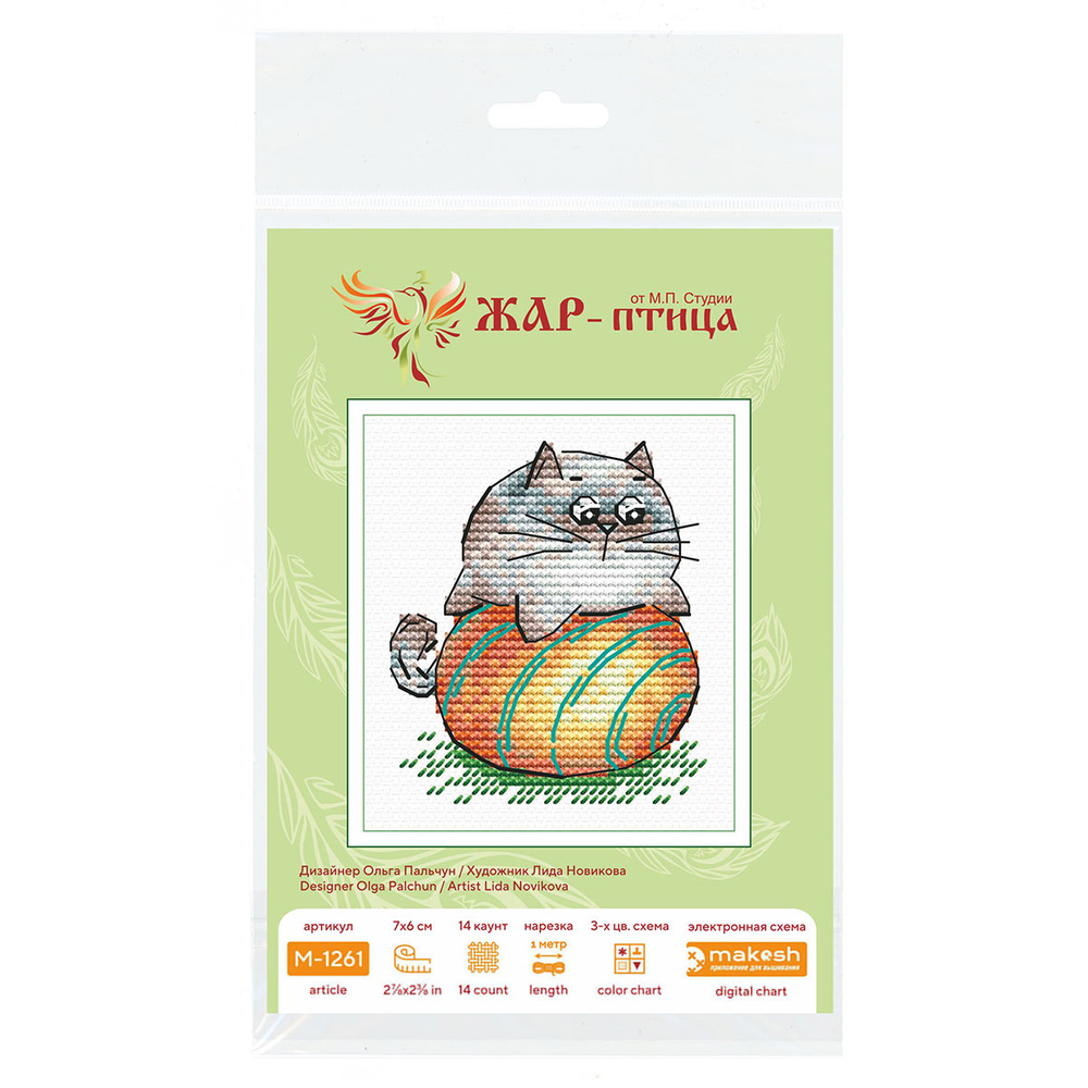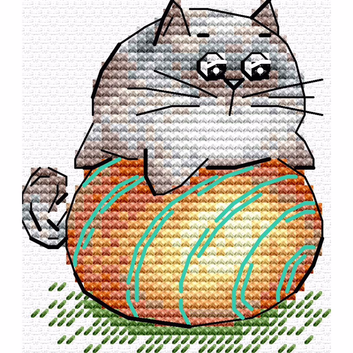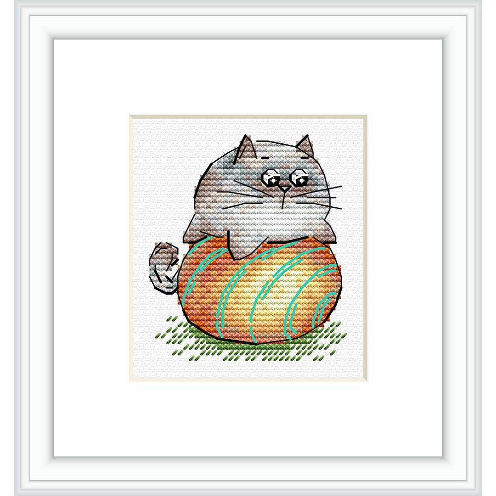На готовом полотне изображена шутливая и игривая сцена с котом, играющим в мяч. Вышивка полна гармонии, любви и беззаботности.