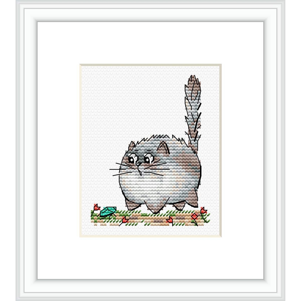 На готовом полотне изображена шутливая и игривая сцена с котом. Вышивка полна гармонии, любви и беззаботности.