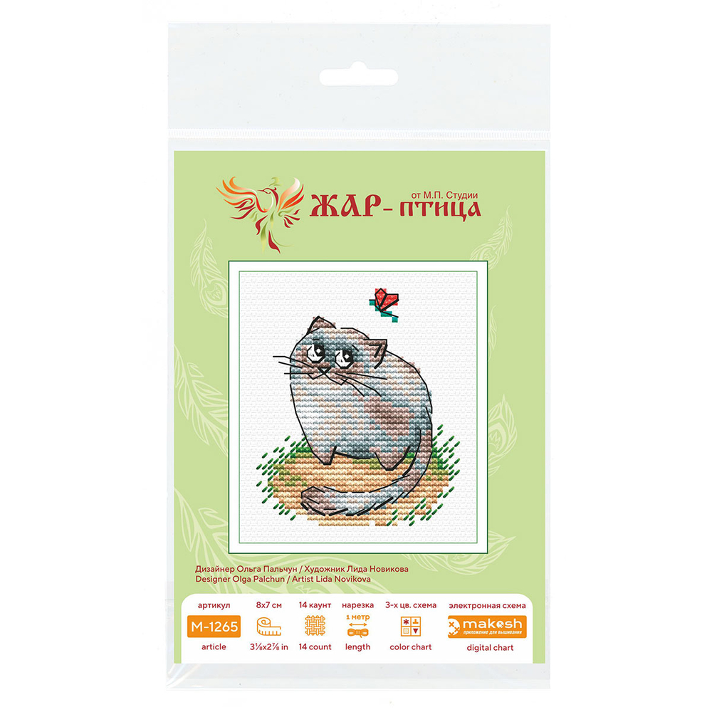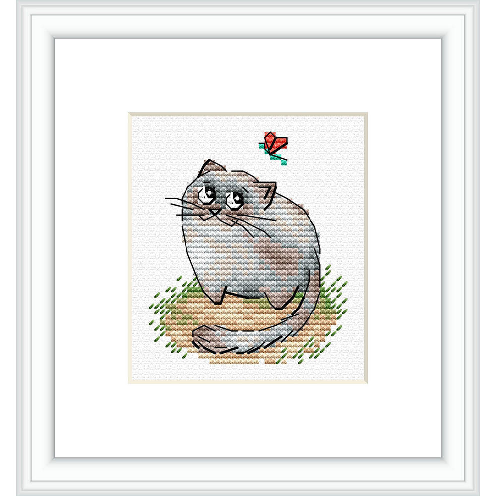На готовом полотне изображена шутливая и игривая сцена с котом, наблюдающим за бабочкой. Вышивка полна гармонии, любви и беззаботности.