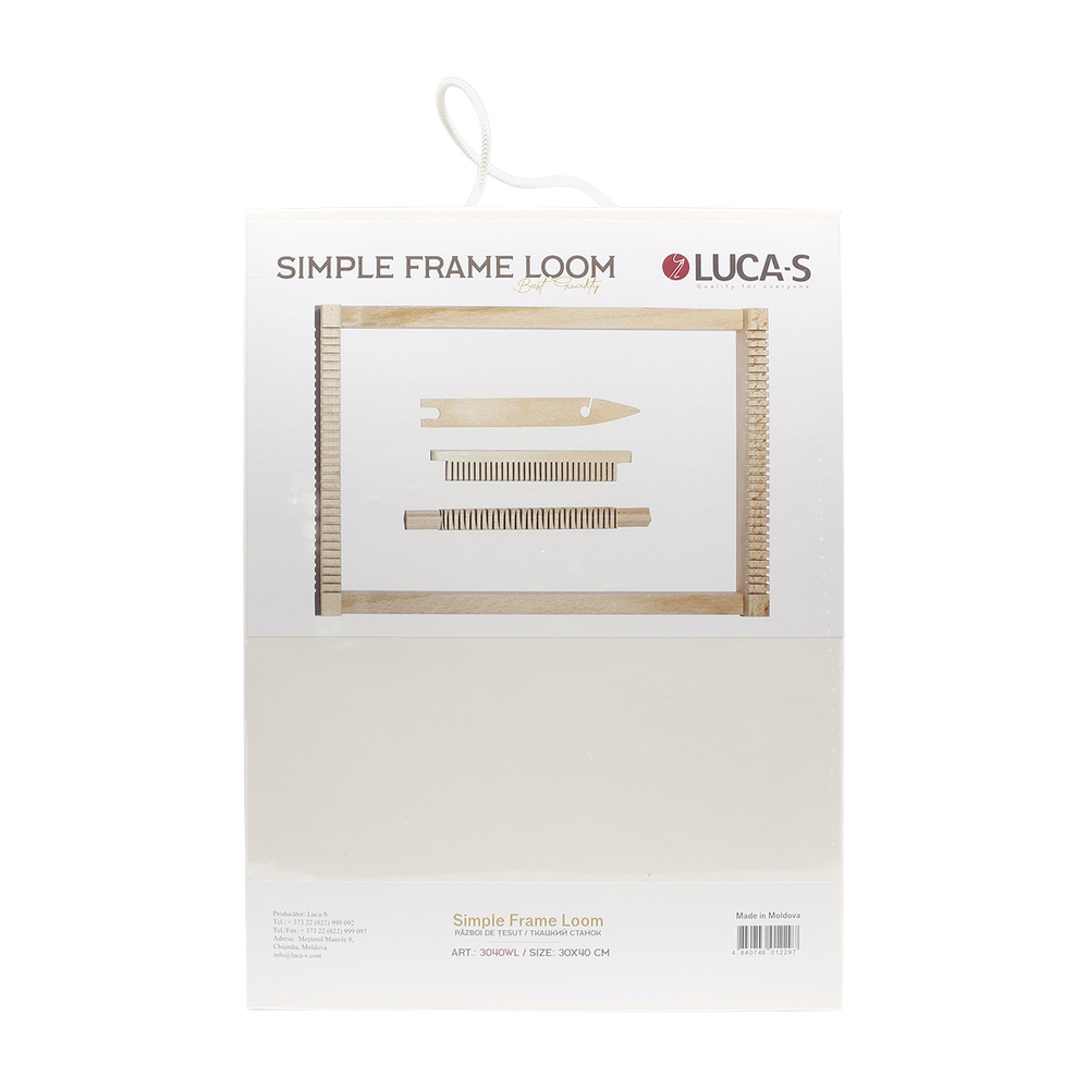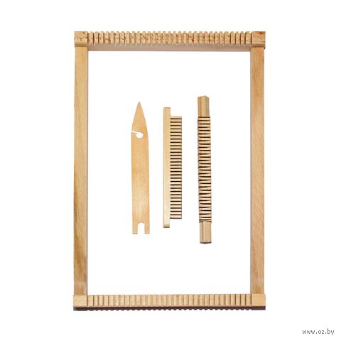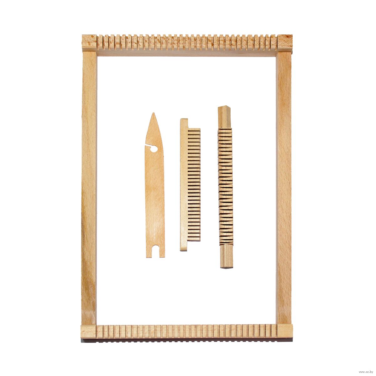 В наборе: деревянная рама, планка квадратного сечения, челнок для наматывания пряжи, гребенка для расчесывания ряда.