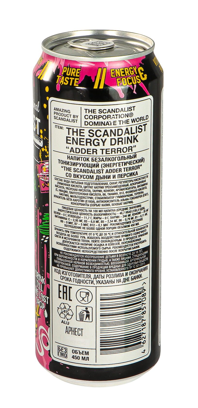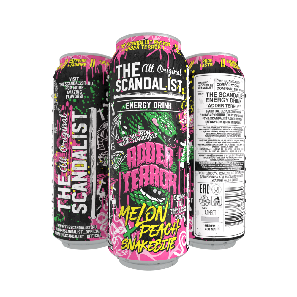 Безалкогольный тонизирующий (энергетический) газированный напиток The Scandalist "Adder Terror" со вкусом дыни и персика.