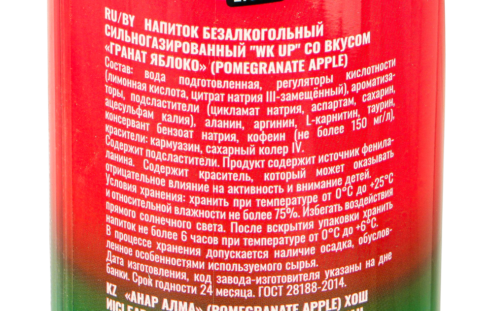 Вода подготовленная, регуляторы кислотности (лимонная кислота, цитрат натрия III-замещённый), ароматизаторы, подсластители (цикламат натрия, аспартам, сахарин, ацесульфам калия), аланин, аргинин, L-карнитин, таурин, консервант бензоат натрия, кофеин (не более 150 мг/л), красители: кармуазин, сахарный колер IV.