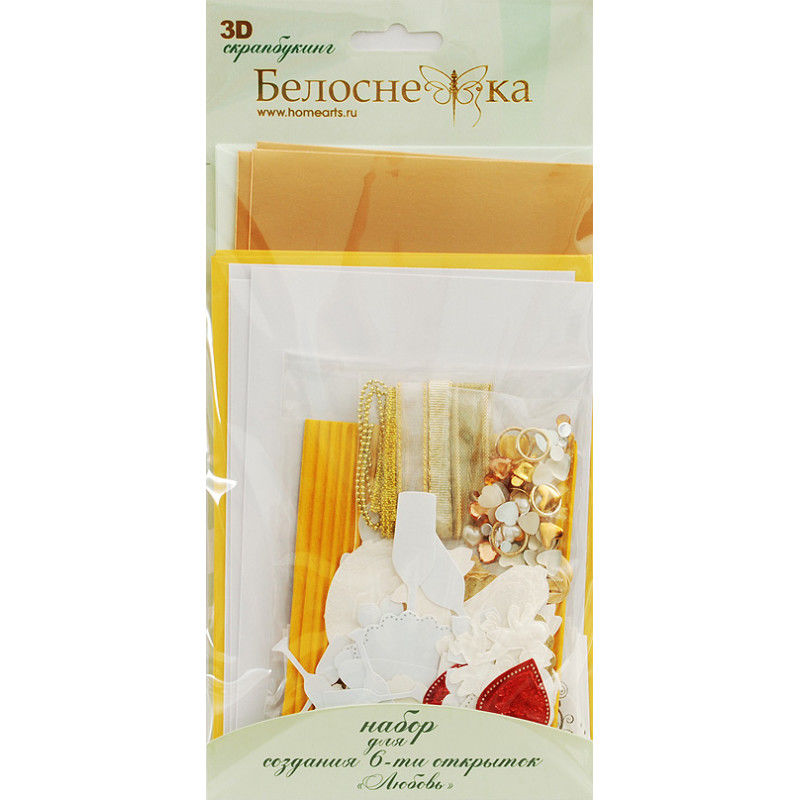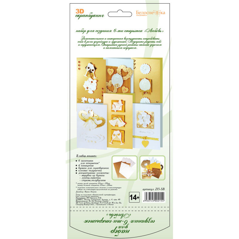 Набор включает в себя заготовки для открыток, различные декоративные бумажные элементы, стразы, бусины, пайетки, ленты и инструкцию по сборке. При создании открыток можно воспользоваться подсказками, расположенными на упаковке, или придумать свою композицию. Скрапбукинг стал популярным и модным увлечением во всём мире. Процесс создания открыток раскроет ваш творческий потенциал, а сама открытка будет неповторимым подарком для друзей и близких.