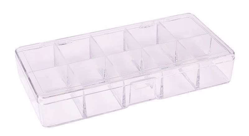 Органайзер состоит из 10 отделений размером 3,4х4,2х3 см, каждое имеет перегородку, что позволяет избежать смешивания хранящихся аксессуаров между собой. Перегородки не вынимаются.