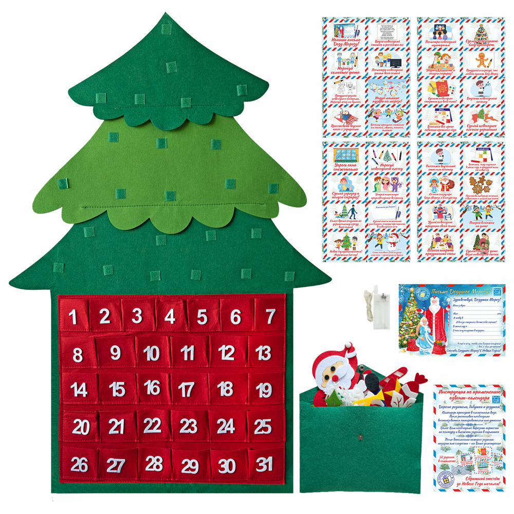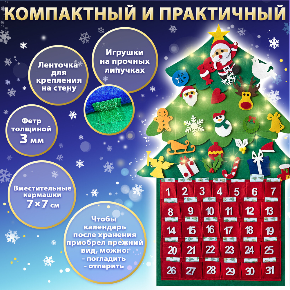 Календарь имеет 31 вместительный кармашек, в который можно вложить задания и превратить ожидание праздника в увлекательную игру для детей. Карточки с заданиями не привязаны к дате – вы сами выбираете, какое задание выполнить с ребенком сегодня. Яркие и красочные игрушки привлекают внимание детей и стимулируют их воображение. Игрушки легко крепятся и снимаются, что позволяет детям самостоятельно украшать елочку, развивая при этом мелкую моторику и координацию движений.