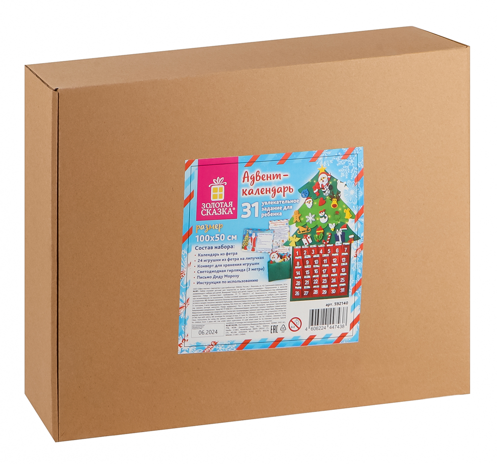 Замечательный календарь, большой, качесьвенный, со множеством интересных дополнений: гирлянда, украшения на липучках, необычные задания.
