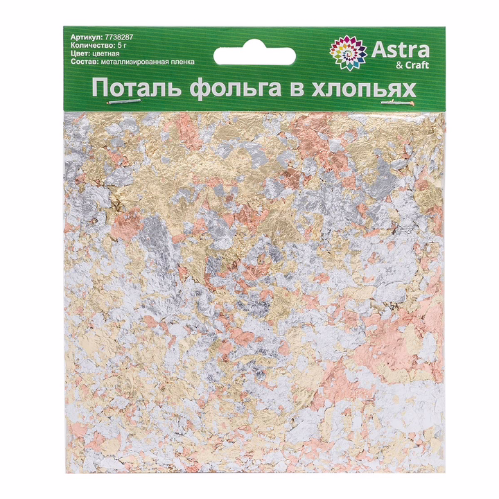 Поталь в хлопьях – это декоративный материал, представляющий собой мелкие кусочки металлической потали, которые используются для создания эффекта золочения и декоративных акцентов на различных поверхностях.