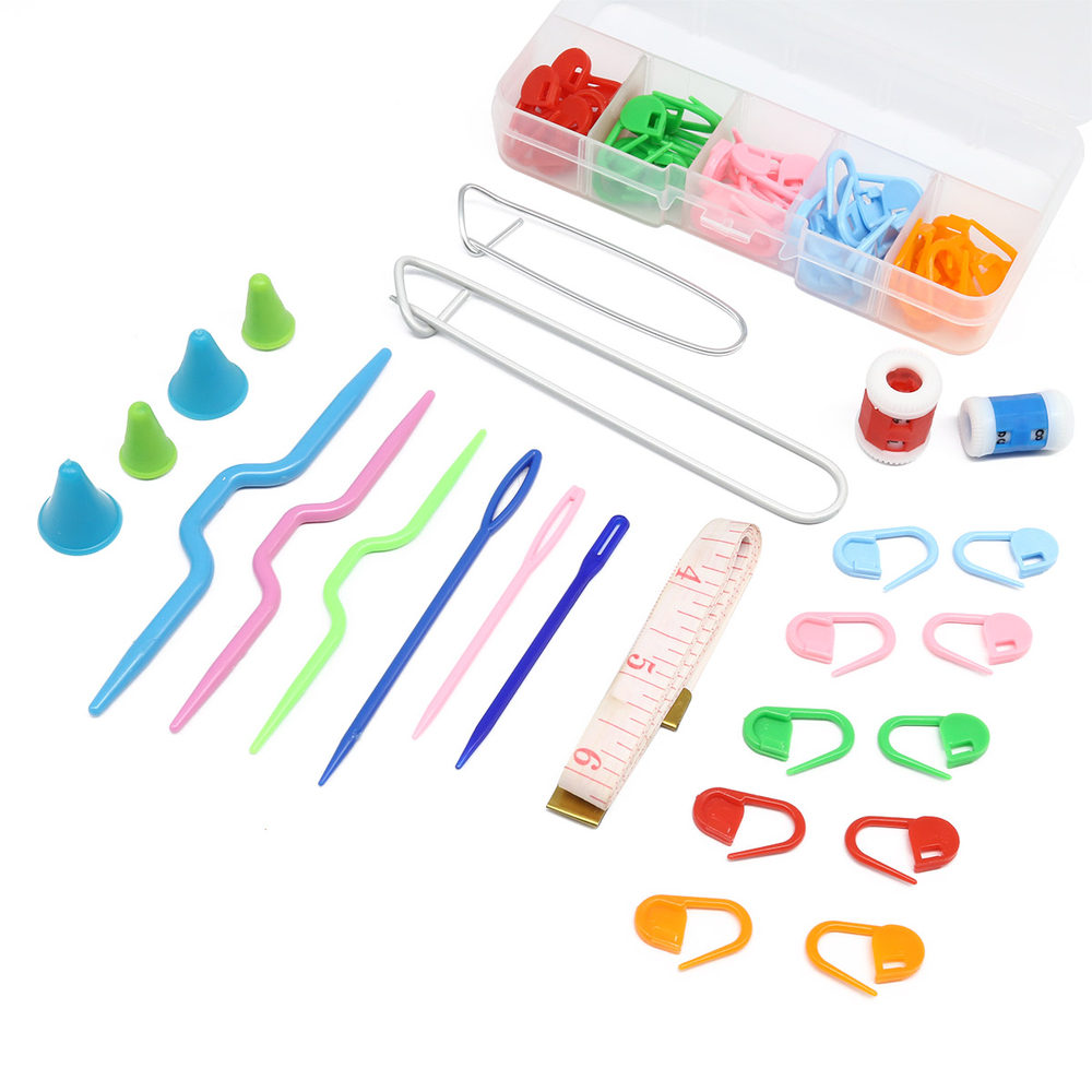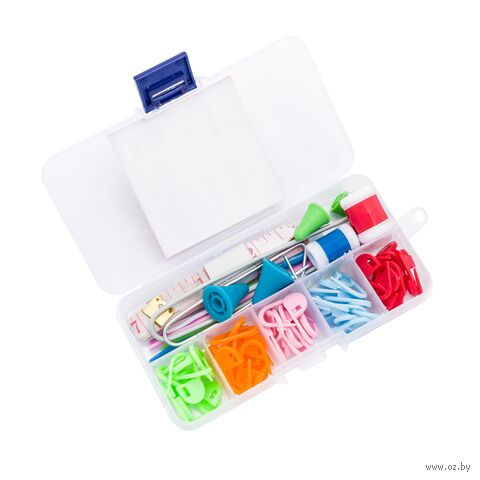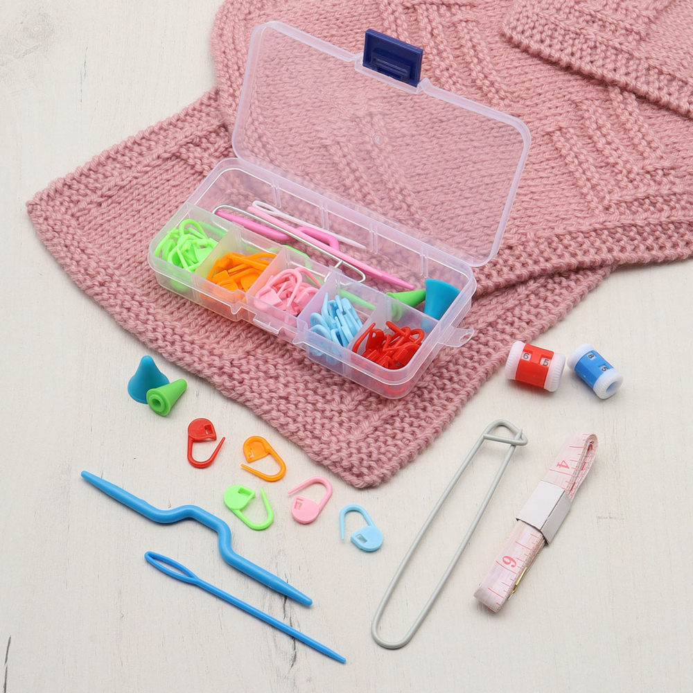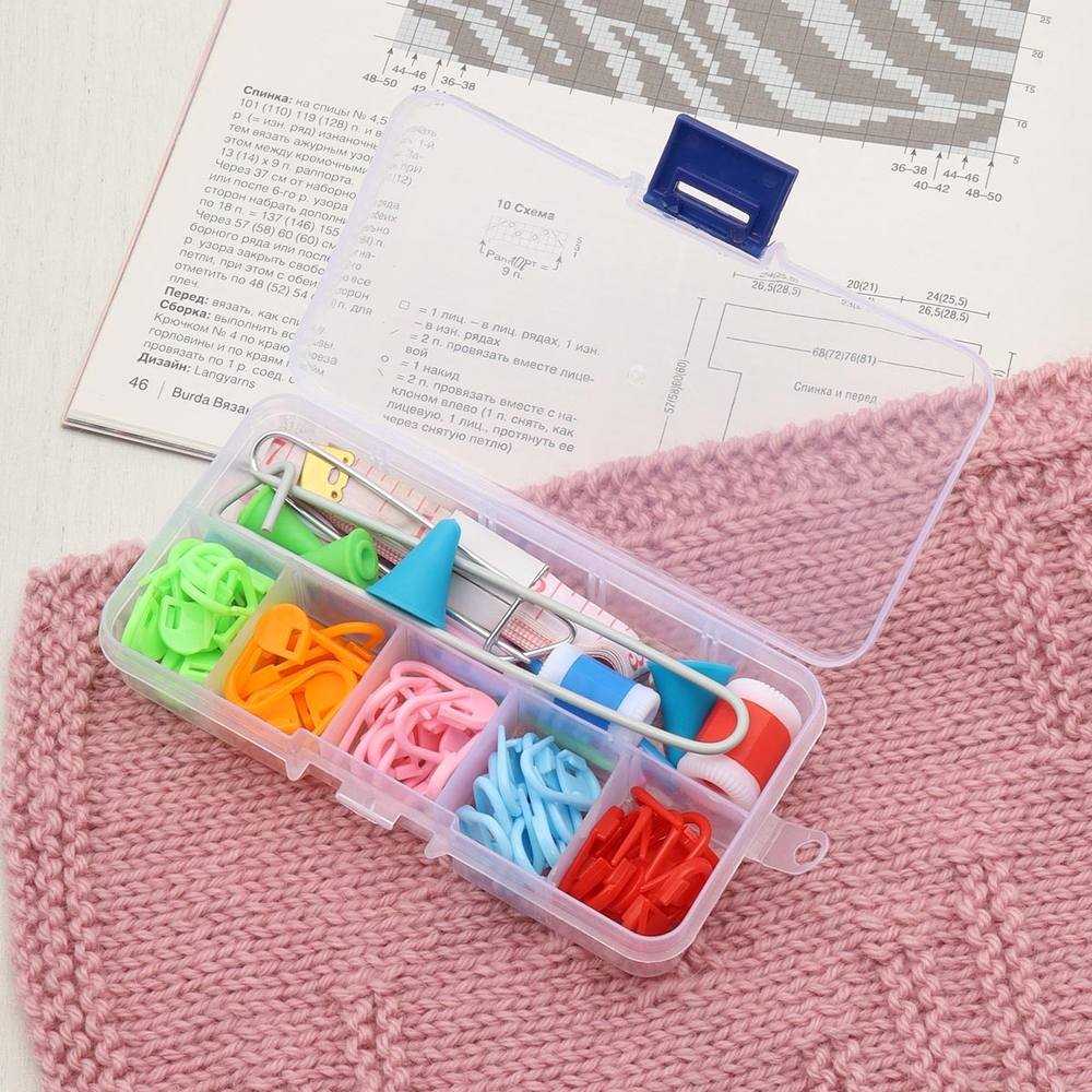 В наборе: счетчик рядов, иглы для шерсти (пластик), наконечники для спиц, спицы вспомогательные для вязания косичек пластик, булавки для вязания, сантиметровая лента, маркировщики петель.