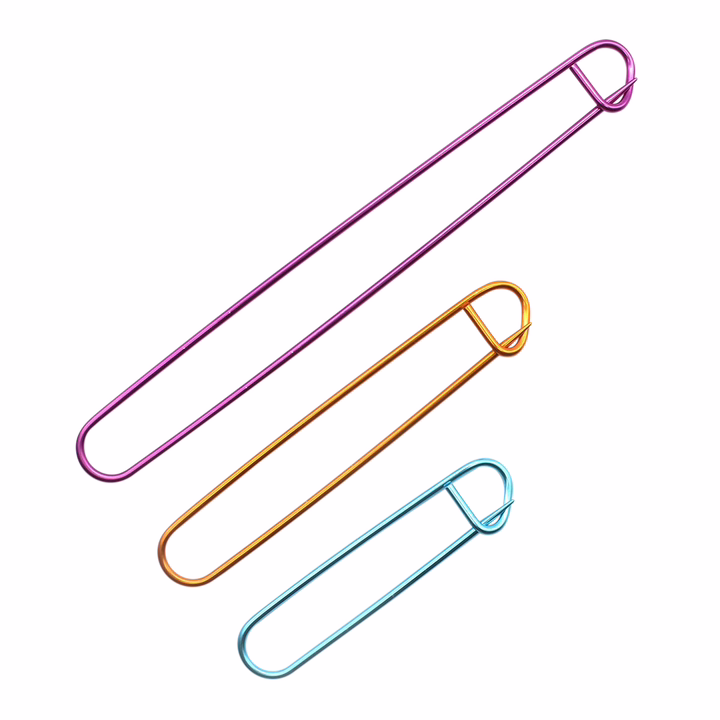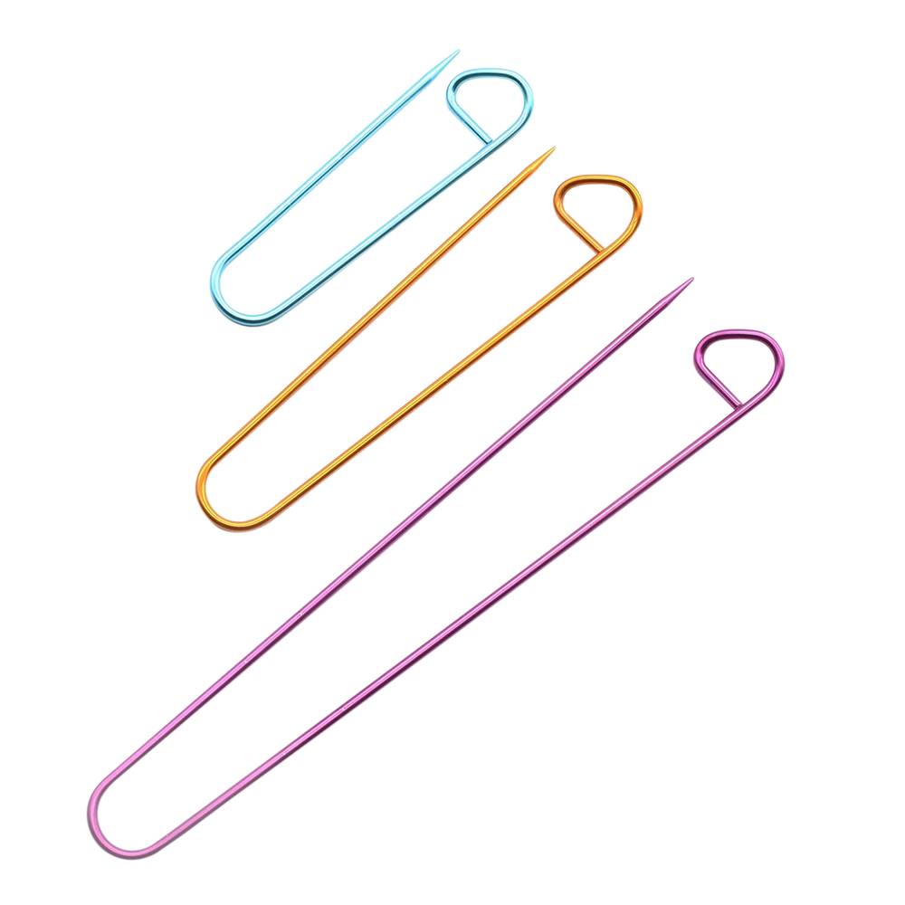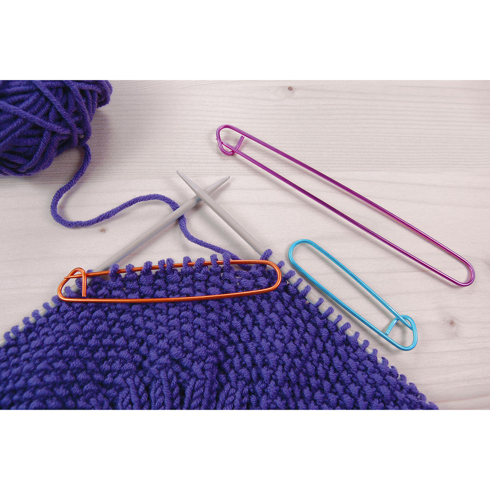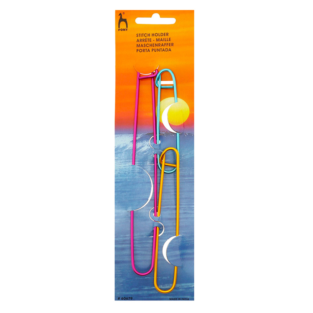 Набор Pony "Stitch Holder", включающий в себя 3 алюминиевые булавки разных цветов и размеров, служит в качестве вспомогательного инструмента для временного снятия группы петель с основной спицы при вязании сложных переплетающихся узоров.