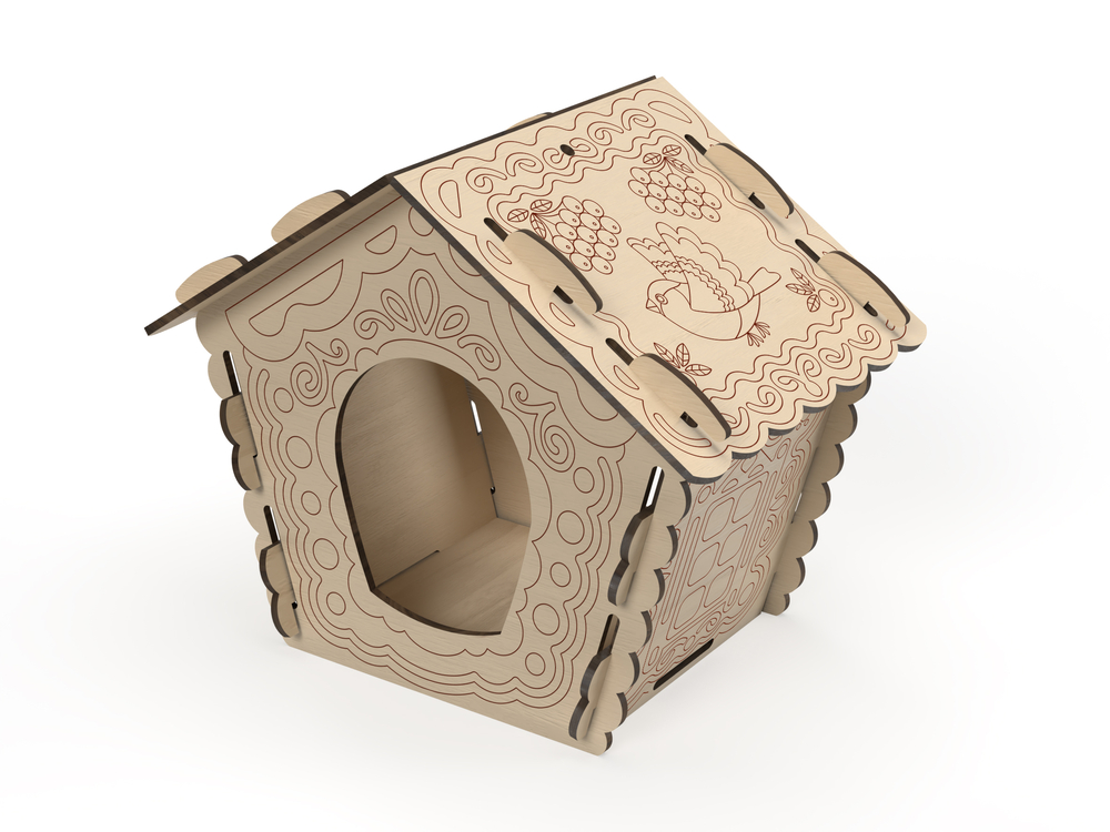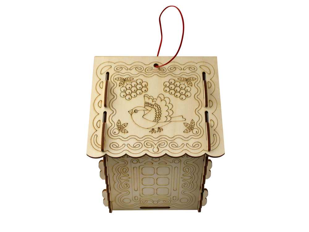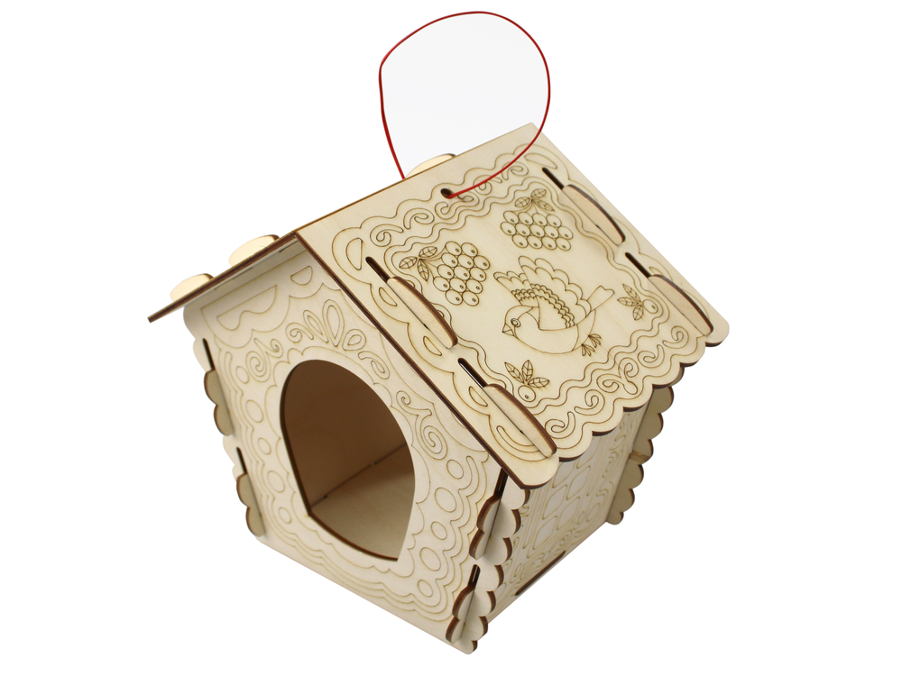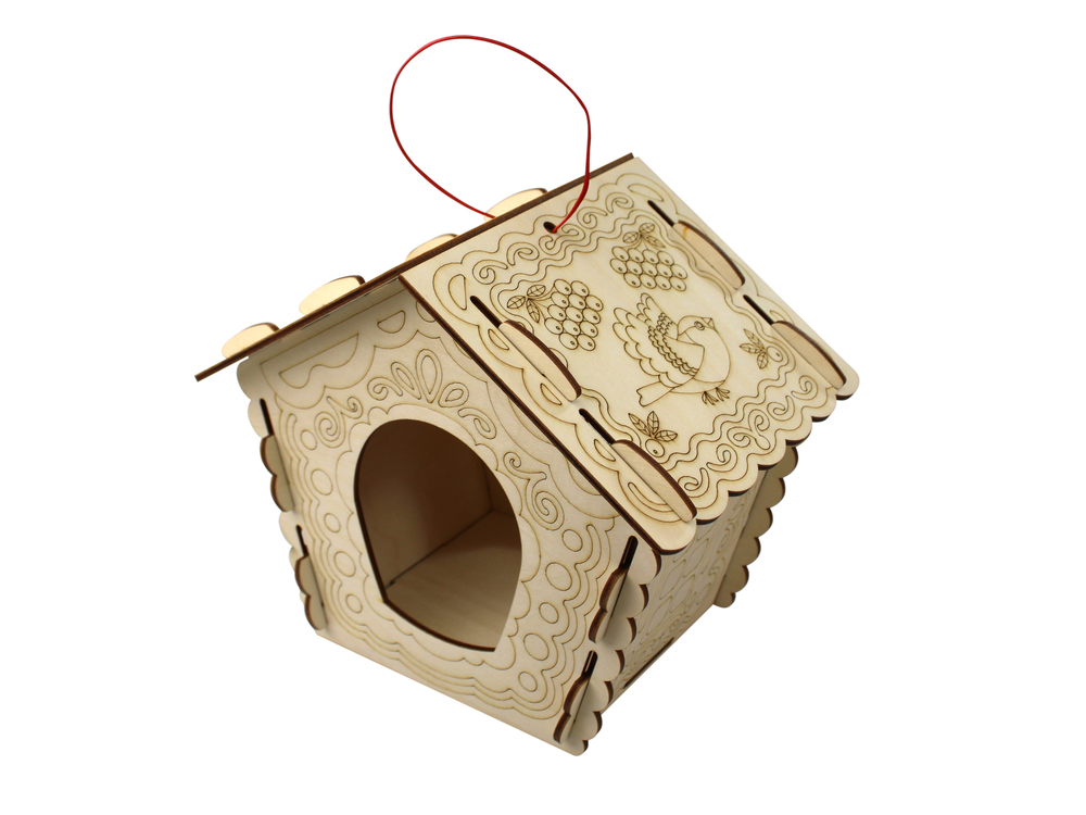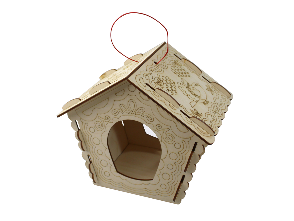 Детали кормушки изготовлены из сертифицированной фанеры толщиной 3,2 мм. А на стенки и крыши нанесены красивые узоры.