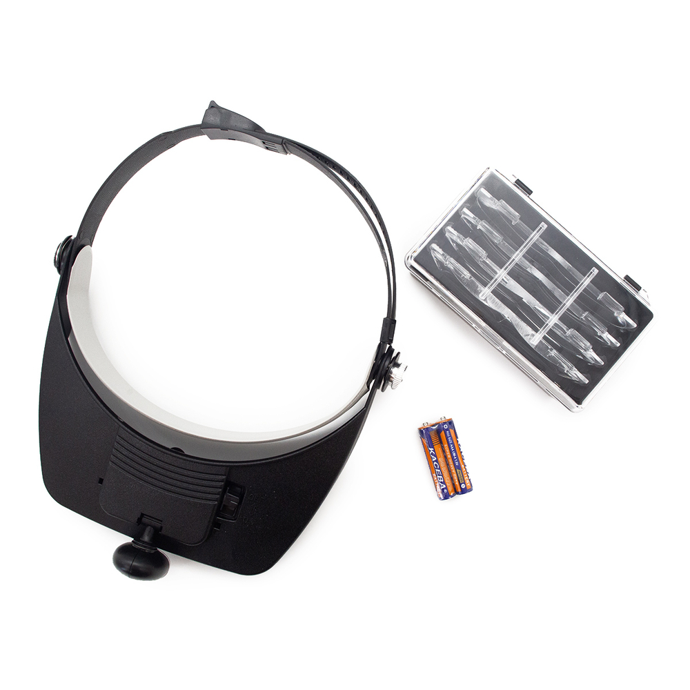 Светодиодная лампа работает от 2 батареек АА. В набор входят 4 различные трехмерные линзы со степенями увеличения 1,2х, 1,8х, 2,5х, 3,5х.