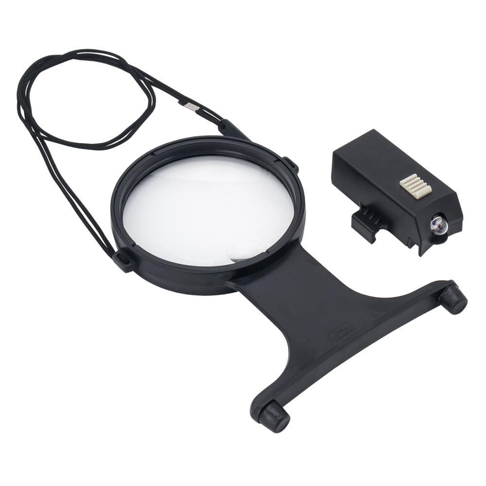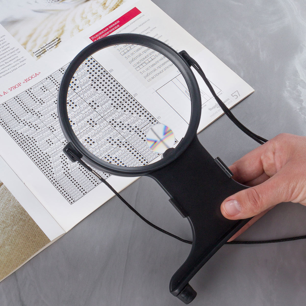 Эта лупа вешается на шею с помощью ленты-шнурка, а затем устанавливается горизонтально на груди. Лупа удобна для чтения и различной мелкой работы – вышивания, плетения, сборки бижутерии, механизмов или конструктора.