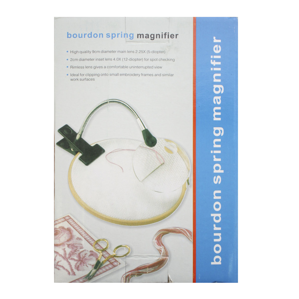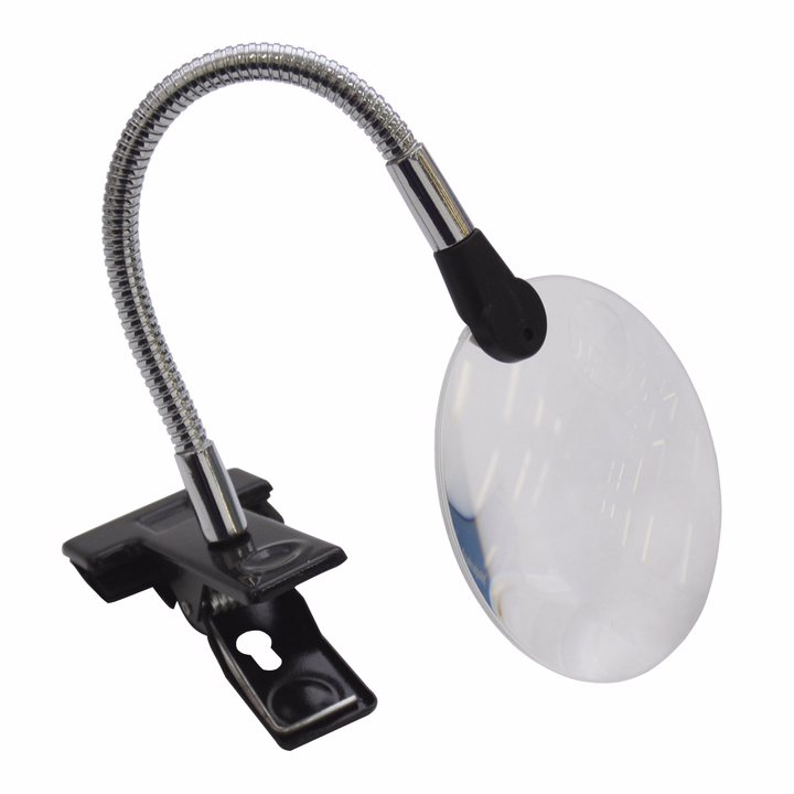 Пластиковая лупа на гибком металлическом штативе. Штатив позволяет регулировать положение линзы под желаемым углом. Без встроенной подсветки. С помощью прищепки лупу можно зафиксировать на крае стола, рамке для вышивания и другой рабочей поверхности.