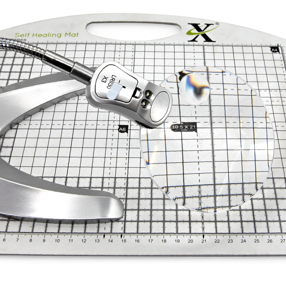 Пластиковая лупа на гибком металлическом штативе. Штатив позволяет регулировать положение линзы под желаемым углом. Лупа подходит для вышивки нитками или бисером, плетения, сборки механизмов или конструкторов, изготовления бижутерии и т.д.