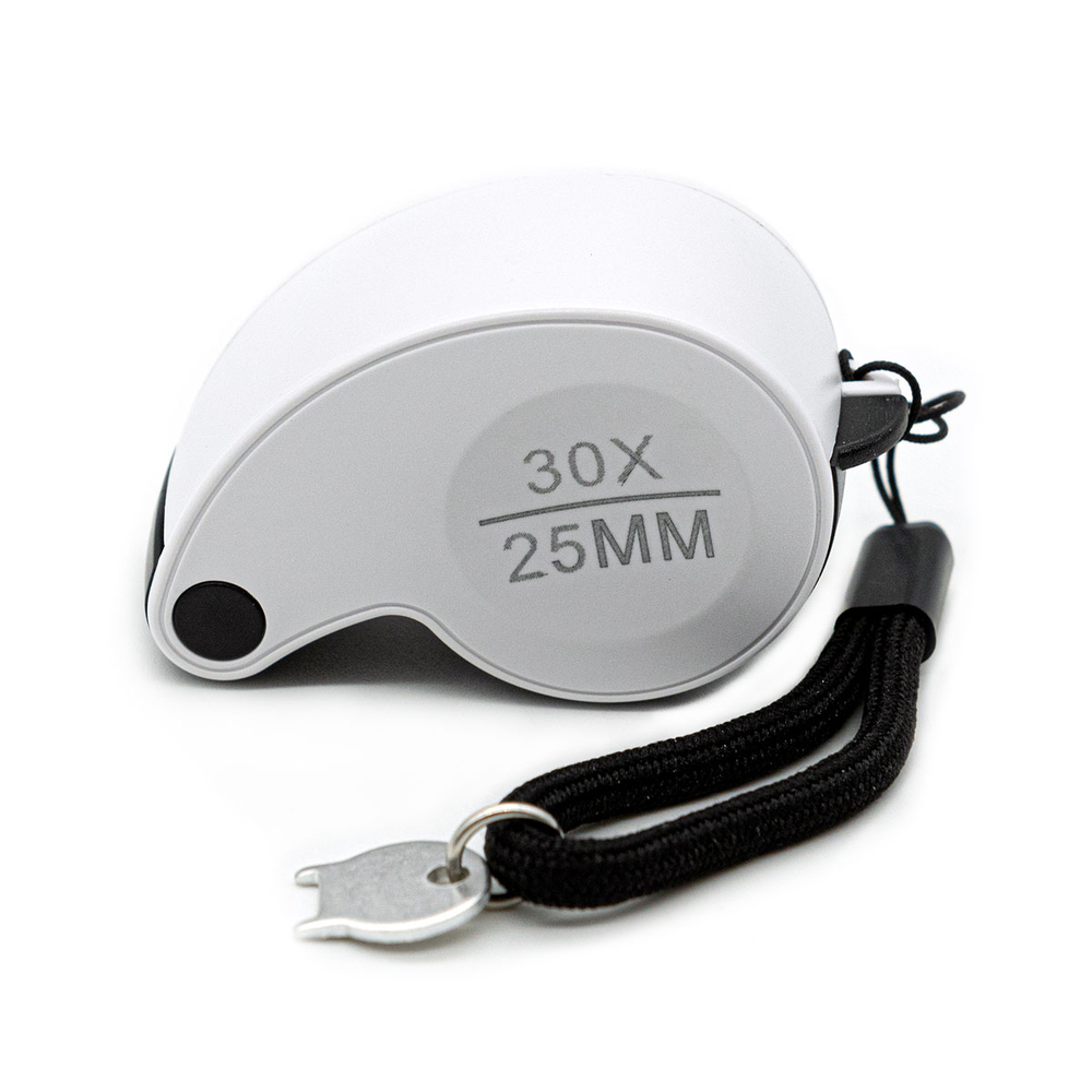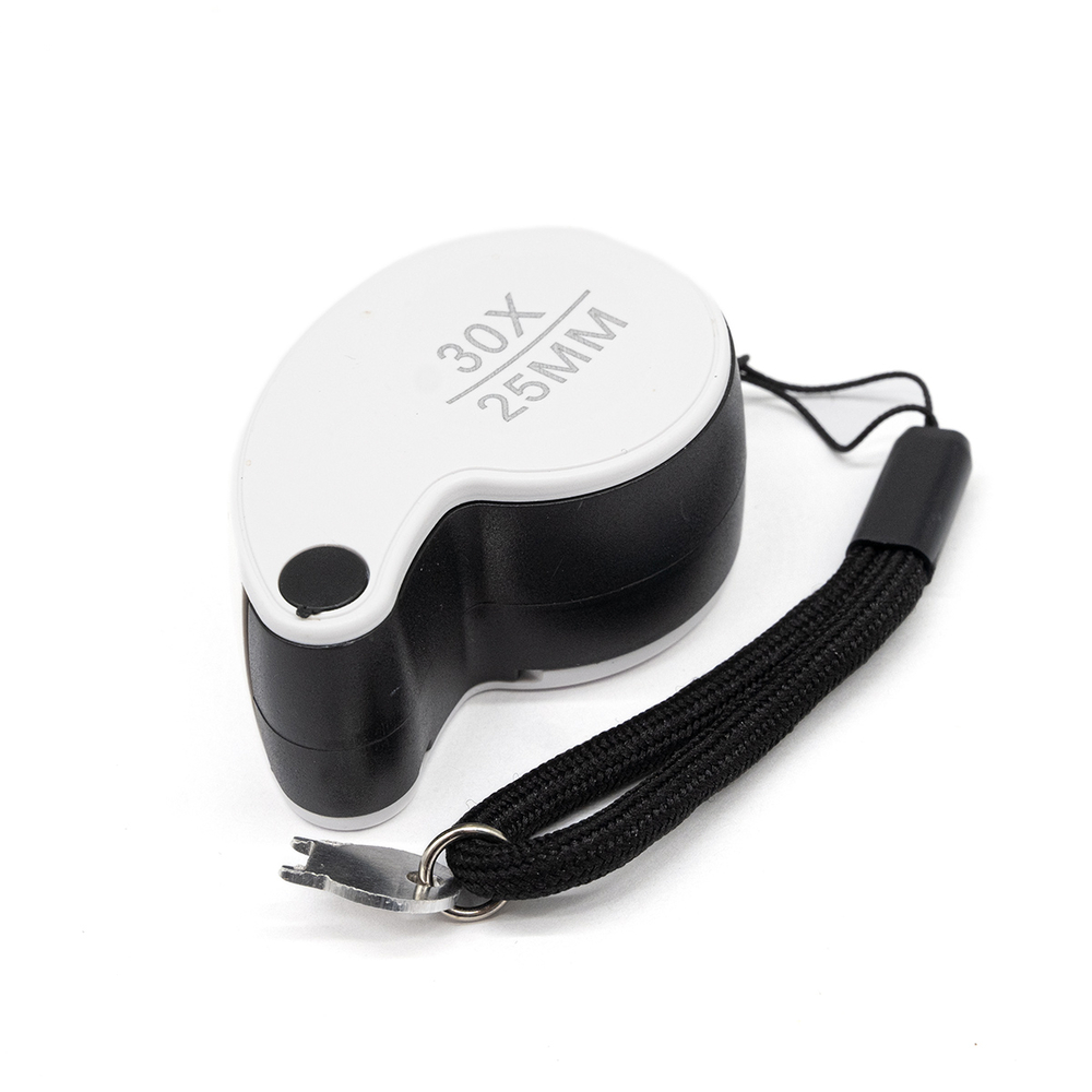 Лупа карманная складная с увеличением 30 крат и диаметром просмотрового поля (линзы) 25 мм. Такая лупа будет полезна людям, чья профессиональная деятельность или хобби связаны с ювелирным делом, созданием бижутерии, в часовых работах, ремонте мелкой бытовой техники, а также при работе с мелкими объектами и деталями.