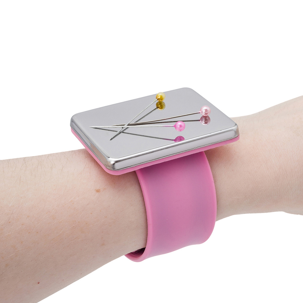 Браслет оснащён гибким силиконовым ремешком длиной 24 см с надёжным фиксатором, который обеспечивает комфортную посадку без использования застёжек. На ремешок прикреплен мощный магнит, способный удерживать иголки, булавки, скрепки и кнопки. Риск случайного рассыпания швейных принадлежностей сведен к нулю – все иголки надежно зафиксированы.