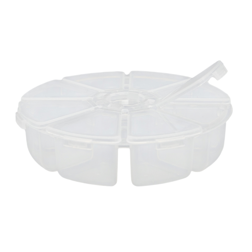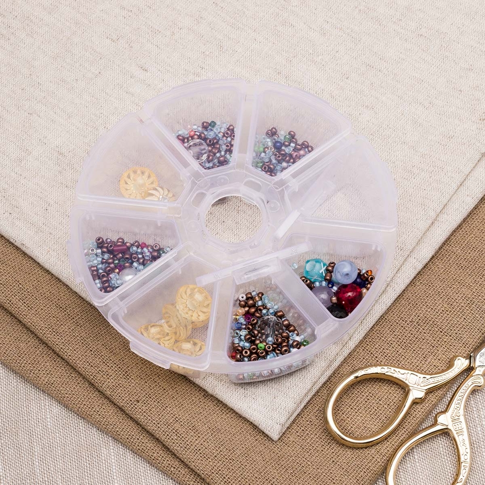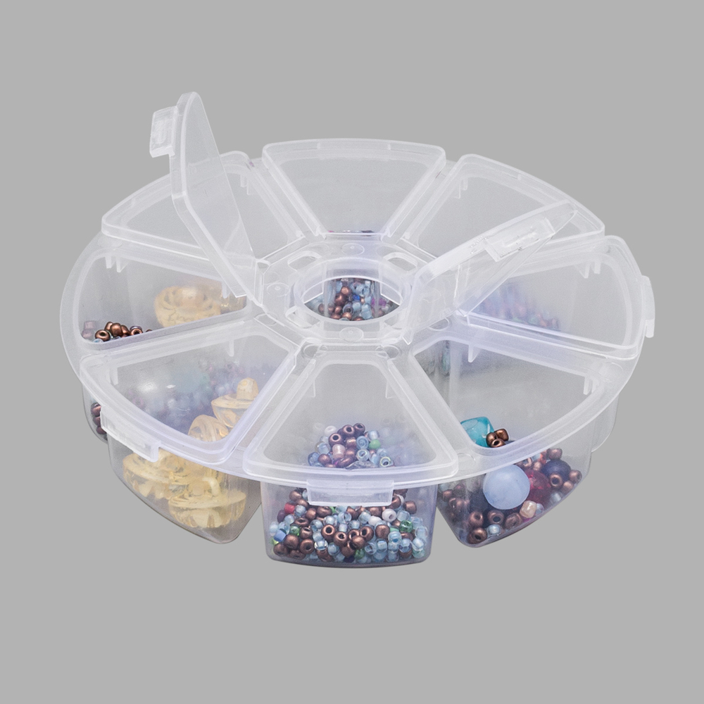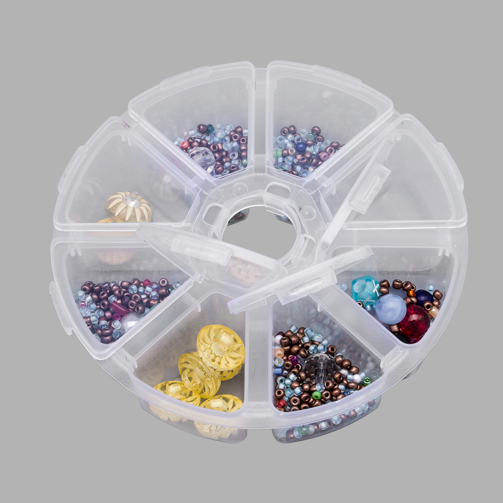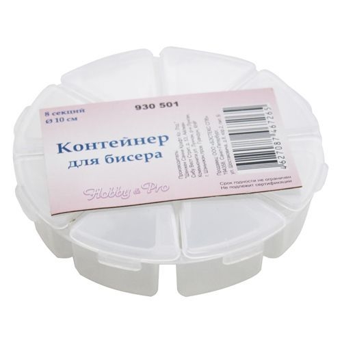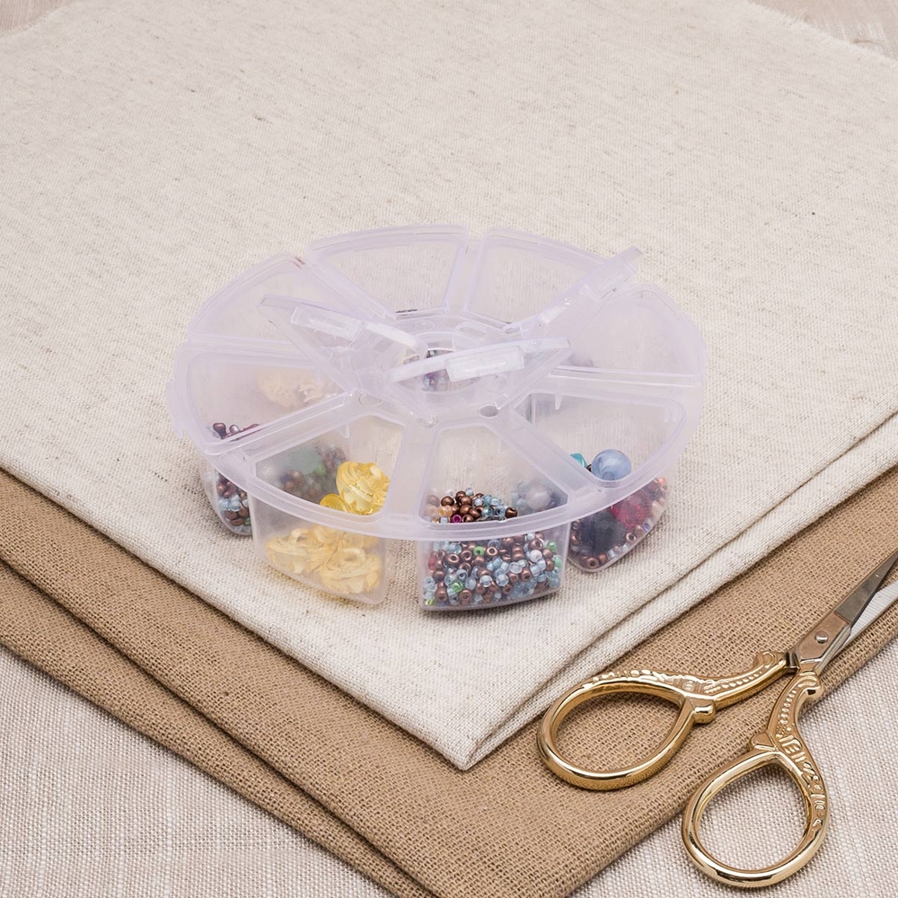 Органайзер для хранения бисера изготовлен из прозрачного пластика, состоит из 8 небольших отделений. Каждое отделение имеет плотно закрывающуюся крышку. С таким органайзером процесс рукоделия станет еще более комфортным и интересным.