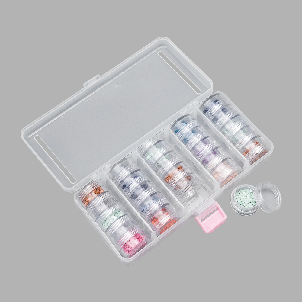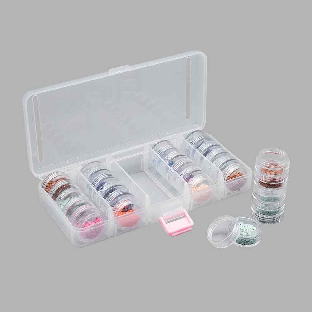 Практичная конструкция включает в себя 25 отдельных баночек с надёжными закручивающимися крышками, которые размещаются в 5 секциях. Баночки надежно защищают содержимое от пыли, влаги и рассыпания, сохраняя его в идеальном состоянии.