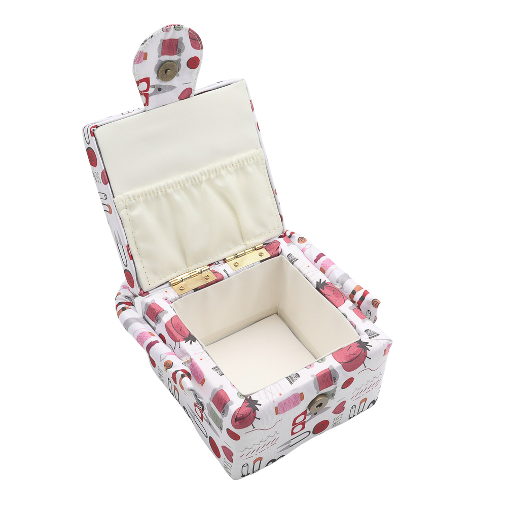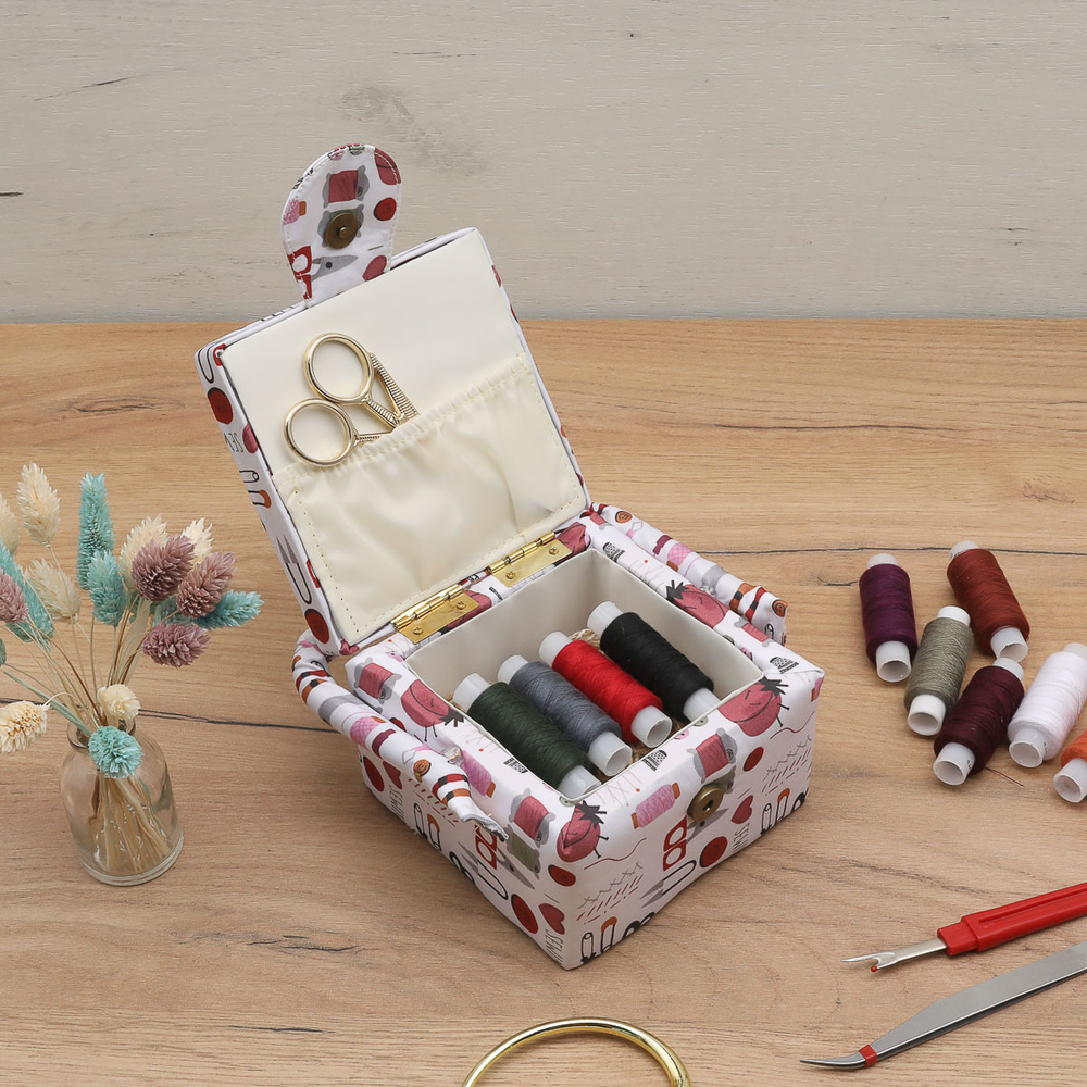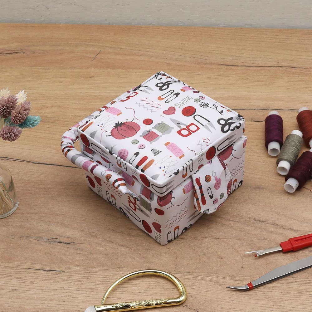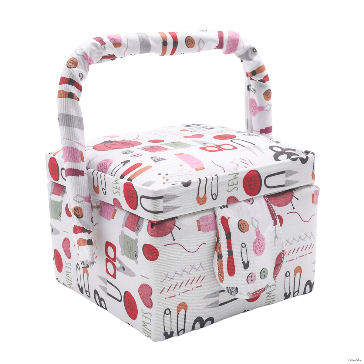Шкатулка обтянута прочной тканью, украшенной принтом с милыми деталями из мира шитья и рукоделия.