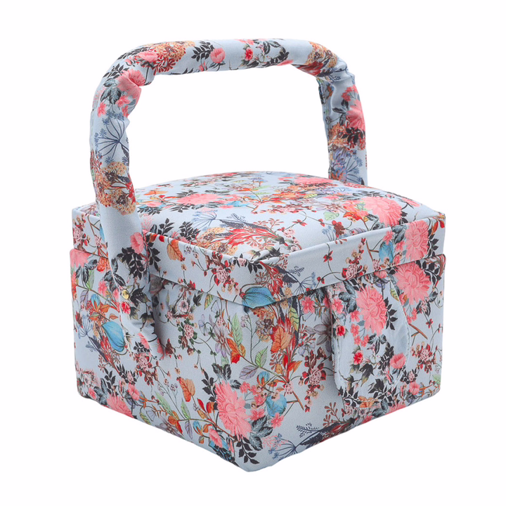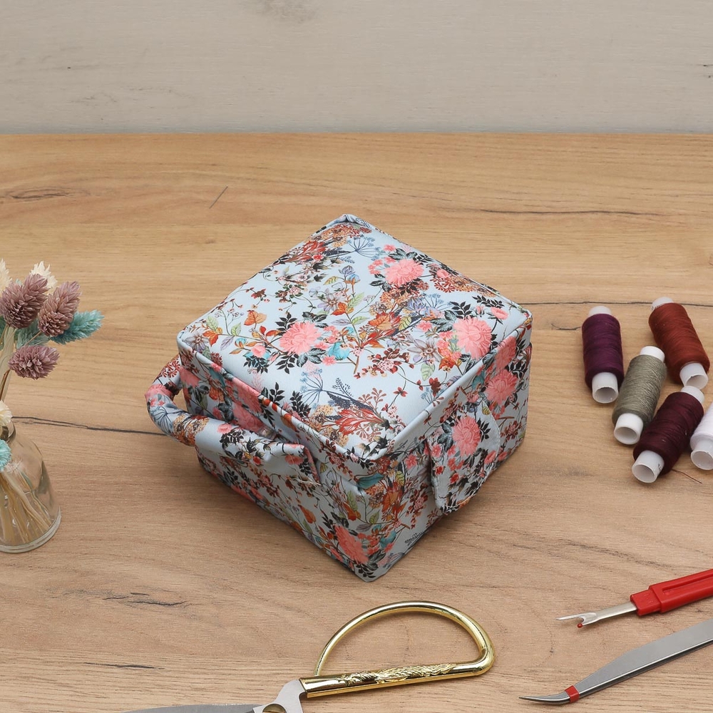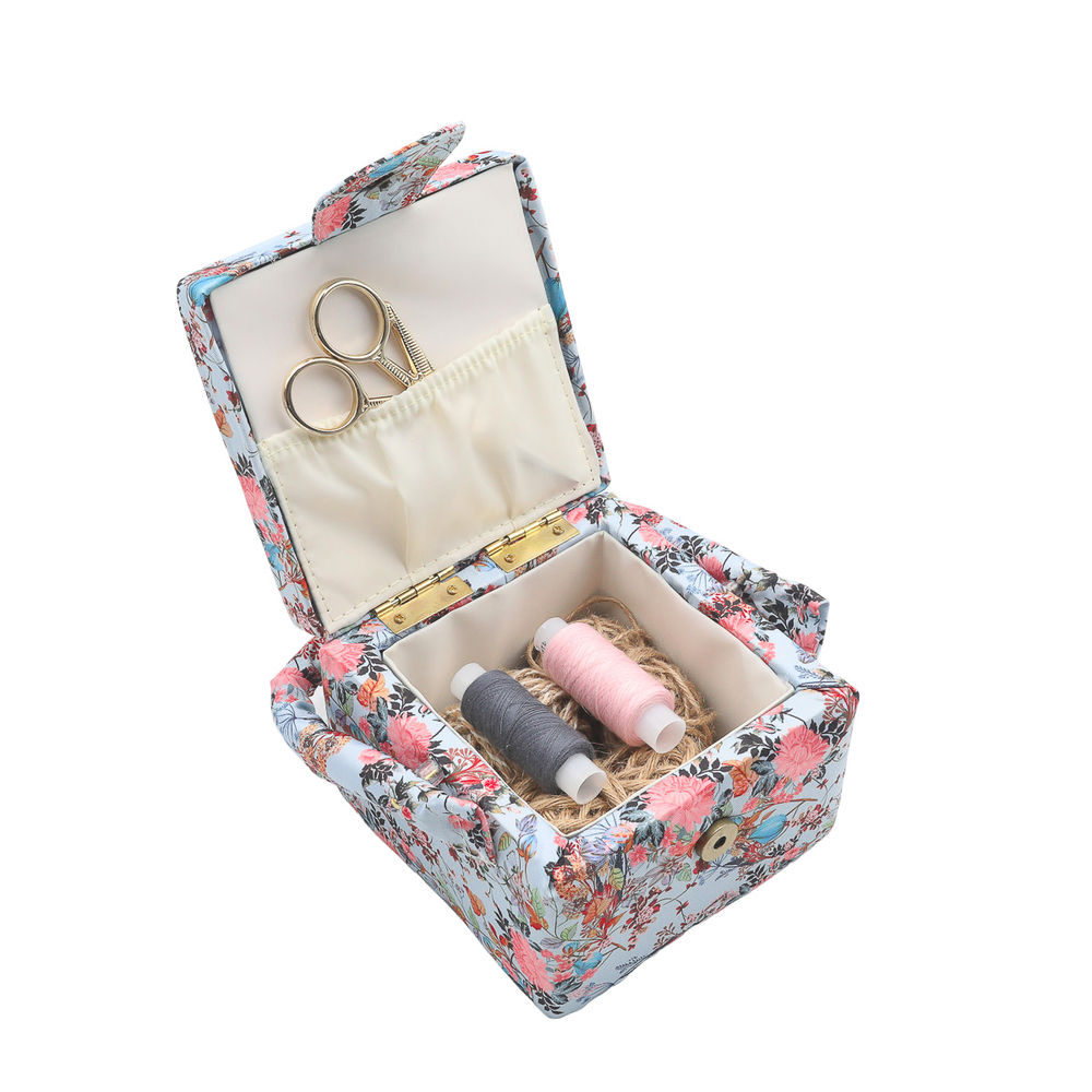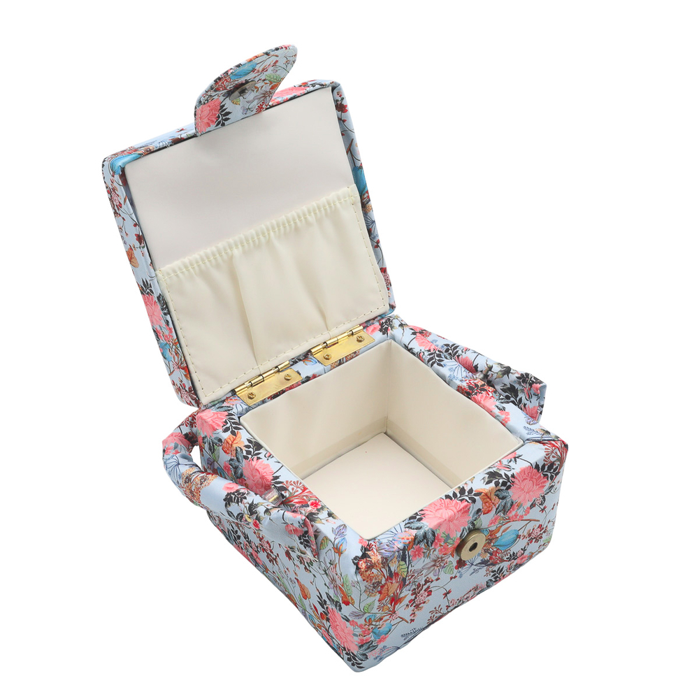 Шкатулка обтянута прочной тканью, украшенной принтом с розовыми пионами.